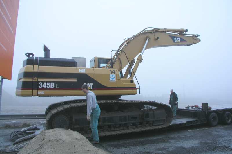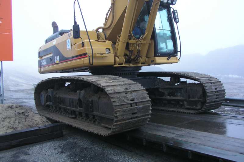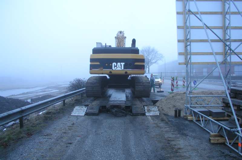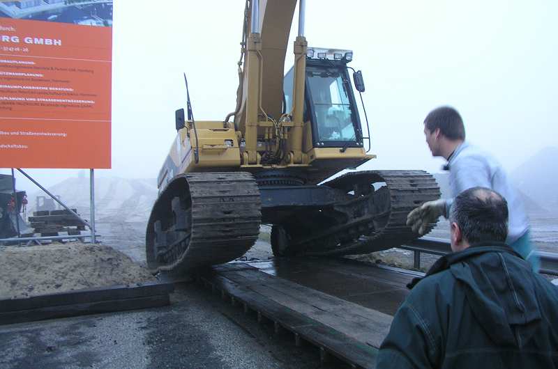 Der Bagger beim Auffahren, kurz vorm Kippen des Fahrwerkes auf die Ladefläche