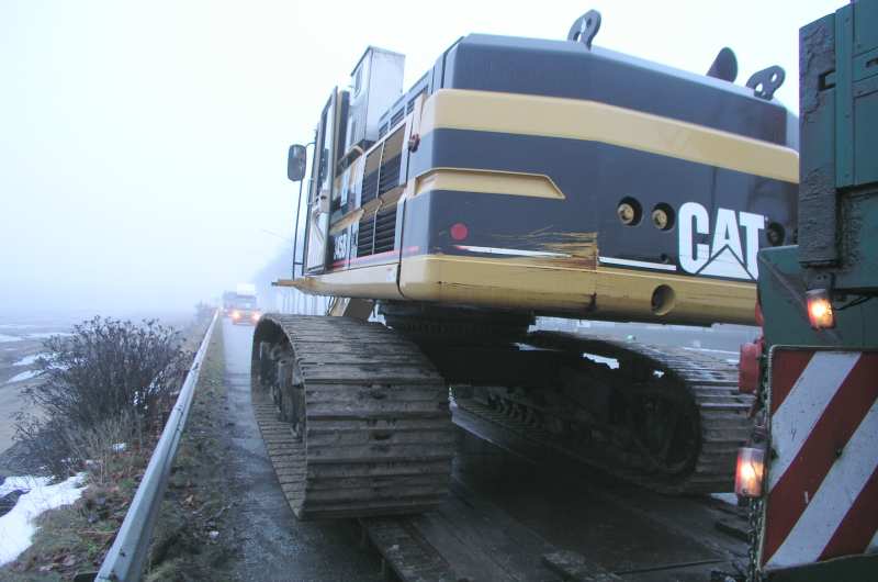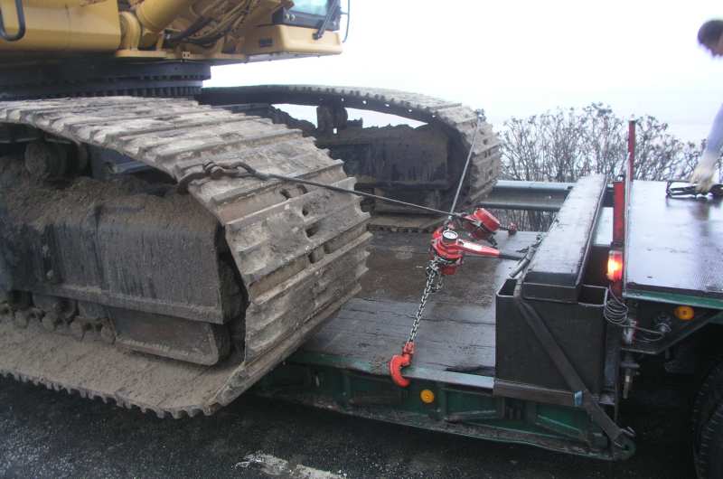 Nachdem das Tiefbett angekuppelt und in Fahrtstellung hochgedrückt wurde, wird der Bagger mittels Kettenzügen