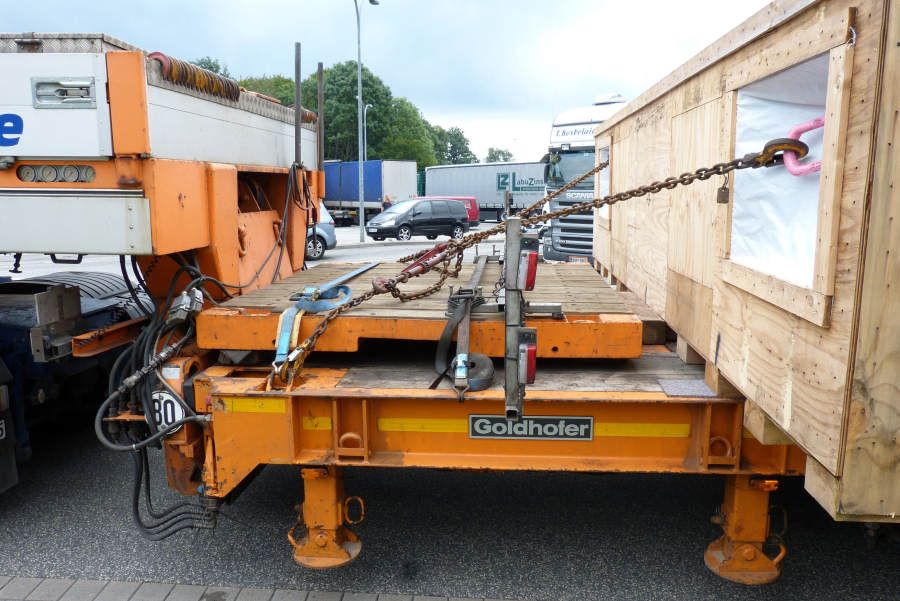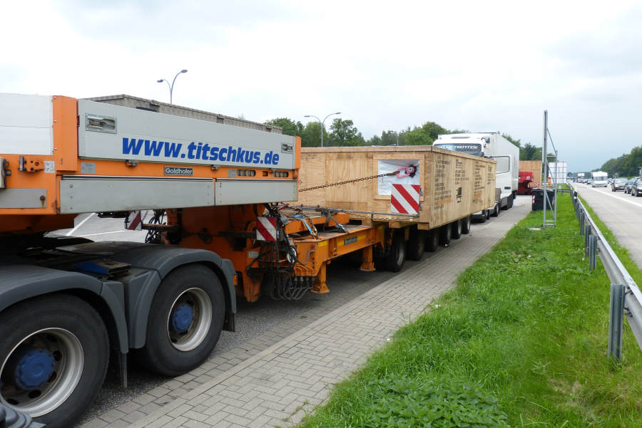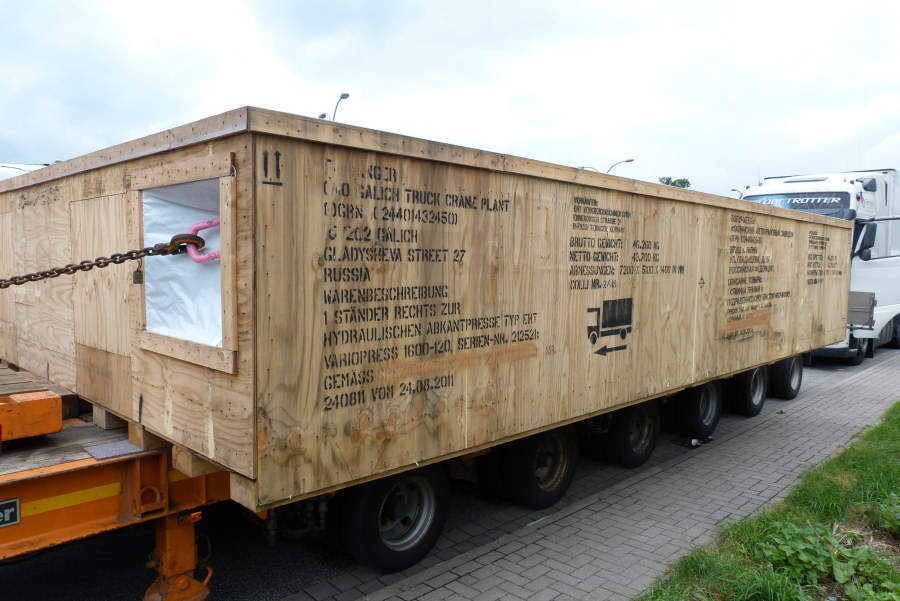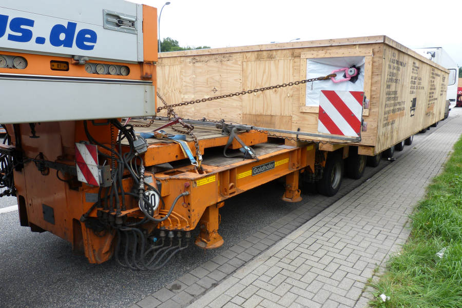 Es wurden zwei Pressenständer, verpackt in Holzkisten, auf sechsachsigen Tiefladern gefahren. die beiden Collies