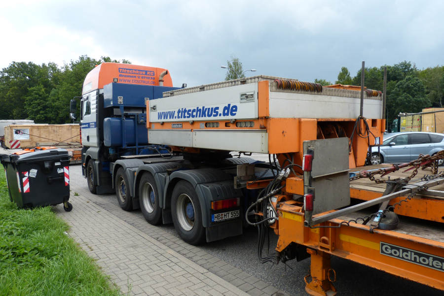 Die Zugmaschine, eine MAN 41.530 TGA, früher im Besitz von Universal Transport zog einen Semitieflader,