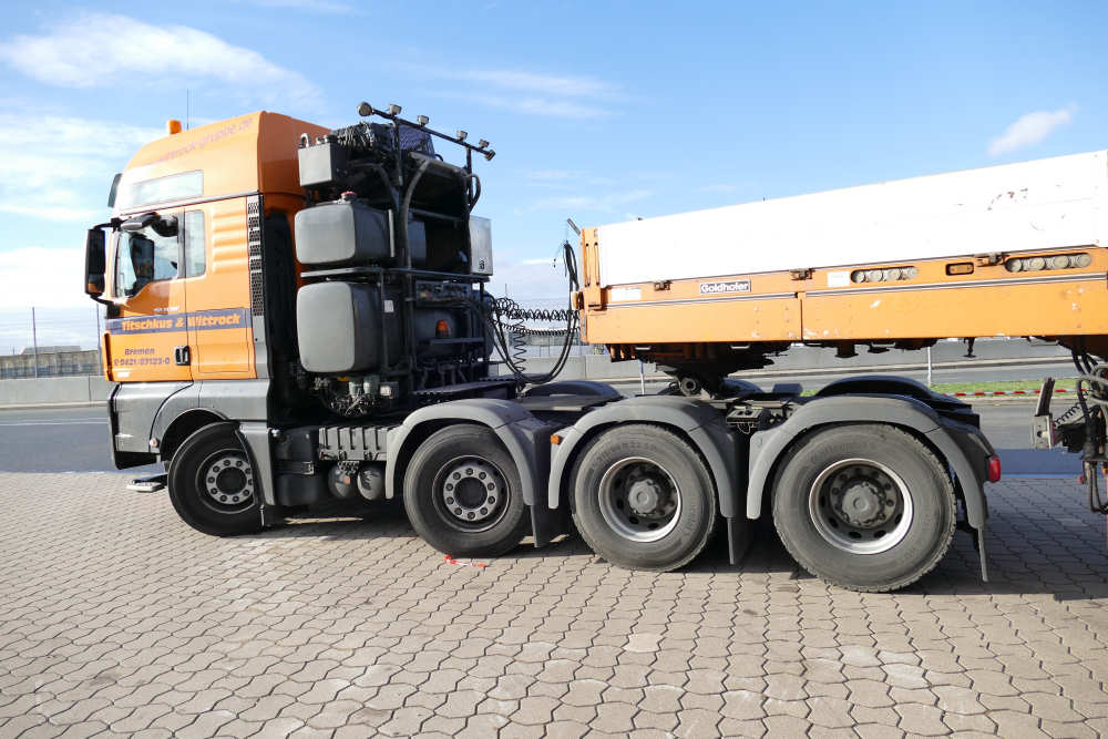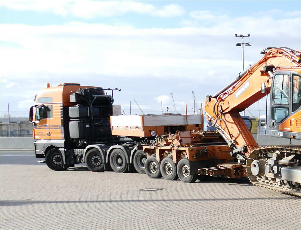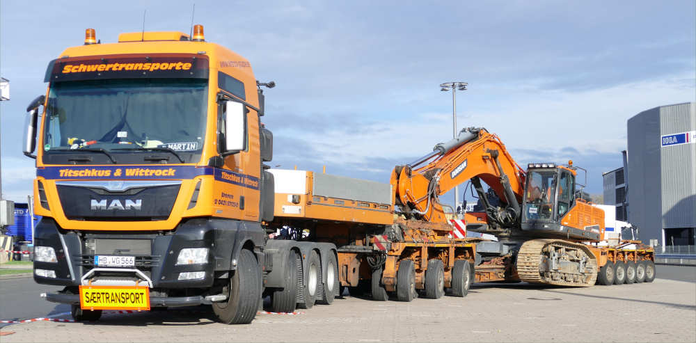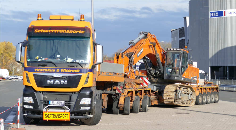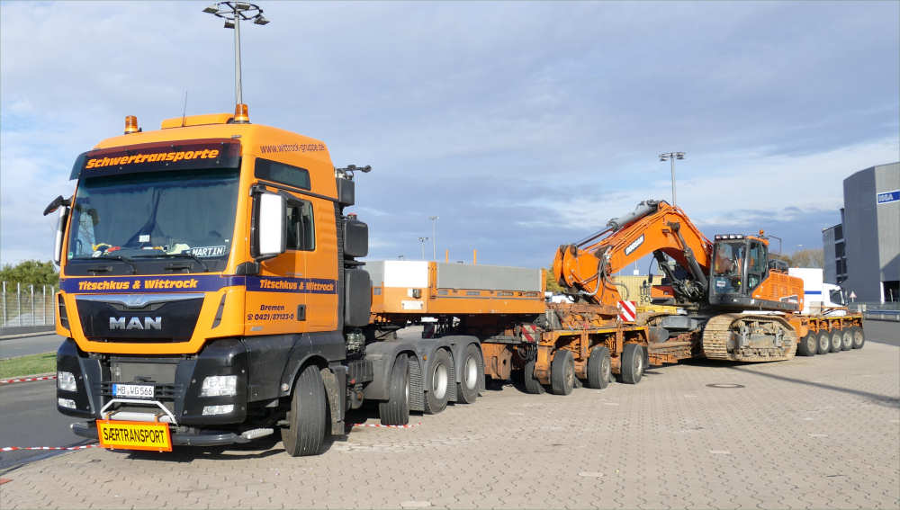 Die Schwerlastkombination bestand aus MAN 41.560 TGX mit Goldhofer THP XLE 3-5 Baggerbrückenkombination.
