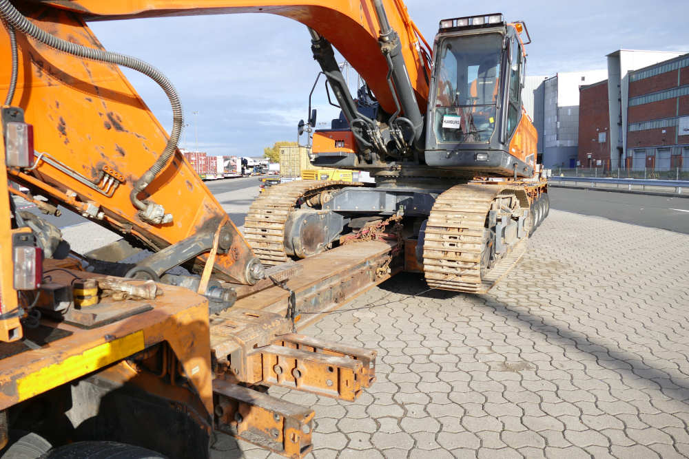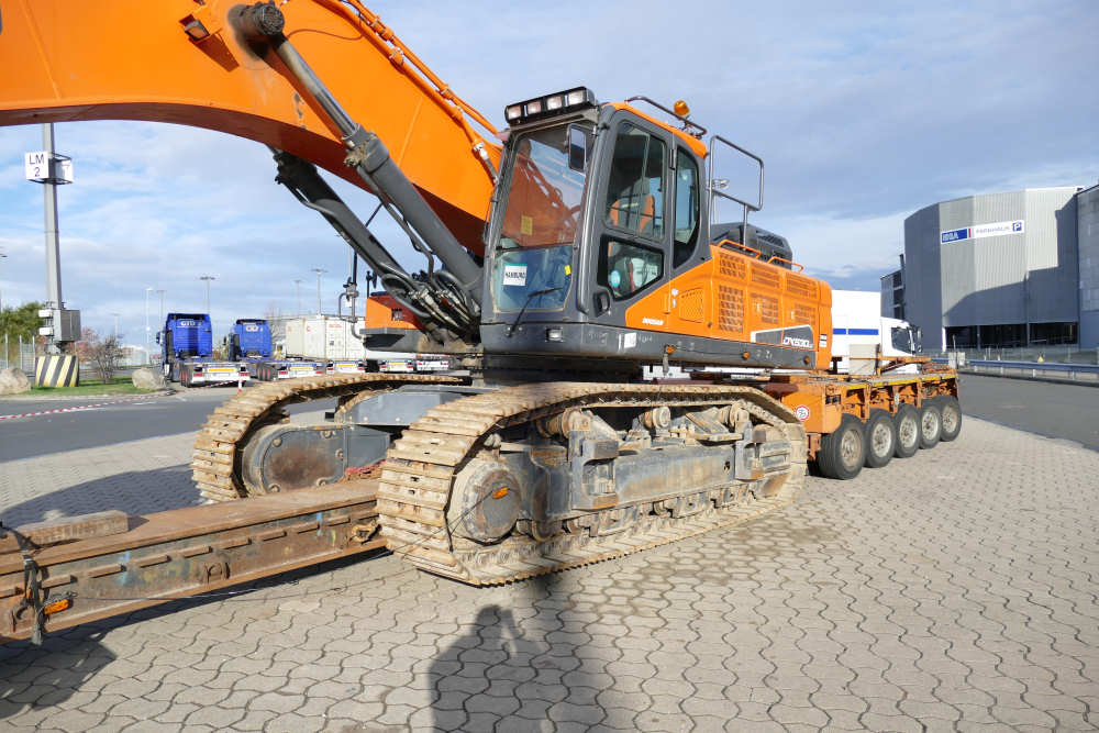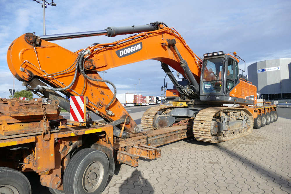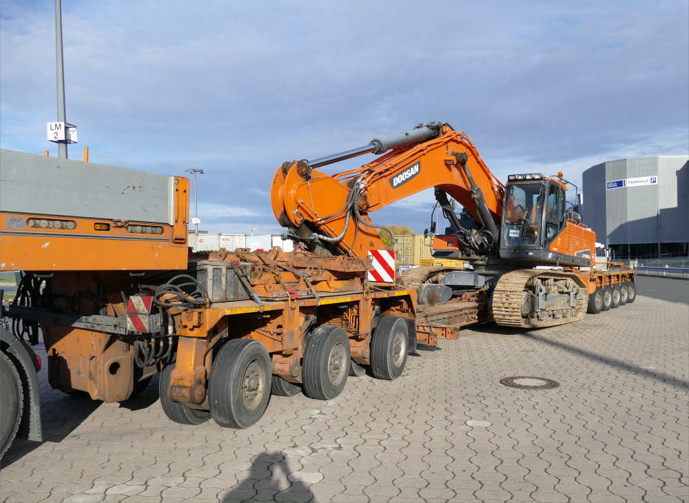 Im November 2018 stand dieser Trasnport vor dem Unikaigelände im Hamburger Hafen. Es wurde ein Doosan DX 530 LC