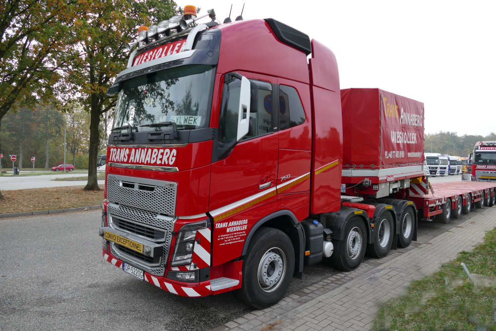 Als Zugmaschine eine Volvo FH 16 750 8x4 Euro 6, mit aufgesatteltem Nooteboom Manoovr 3-7 Multi MPL Semitieflader.