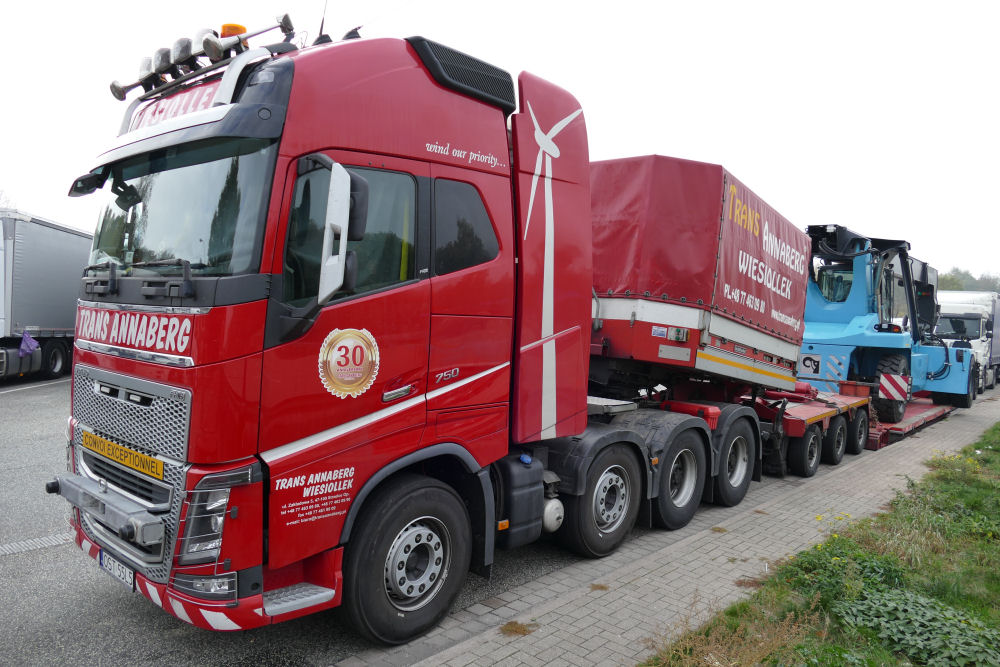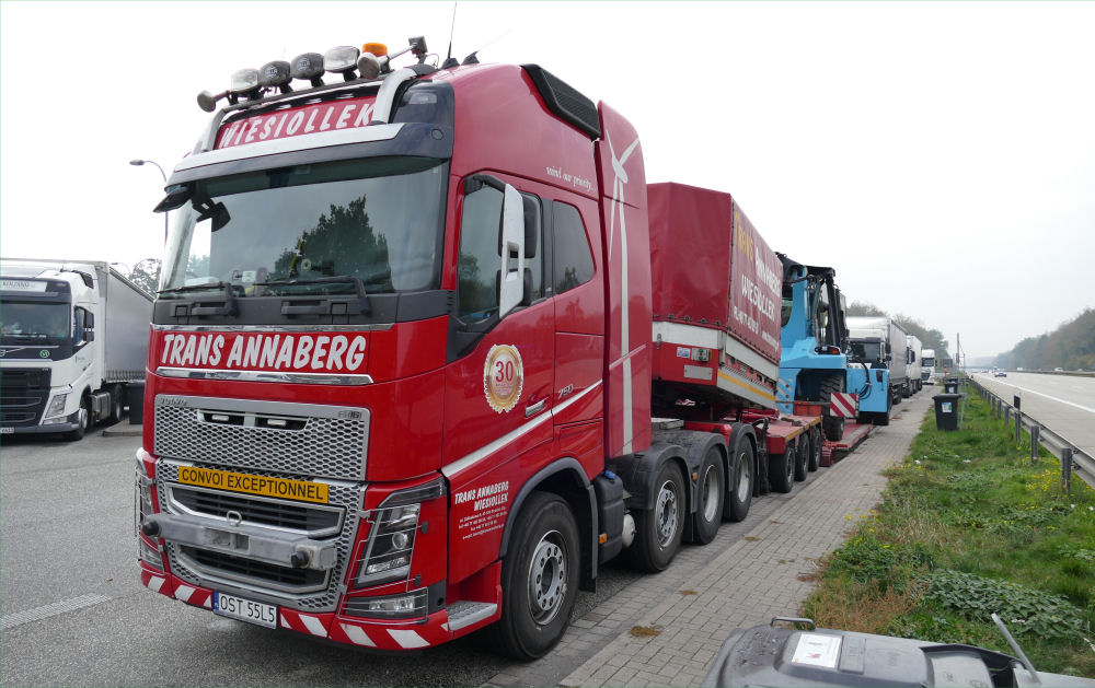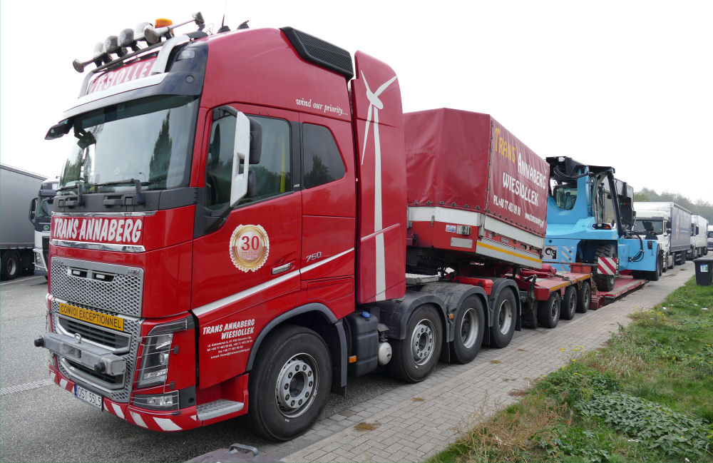 Volvo FH 16 750 8x4 mit Goldhofer 3-5 Tieflader und Kalmar DRG 100 Reachstacker