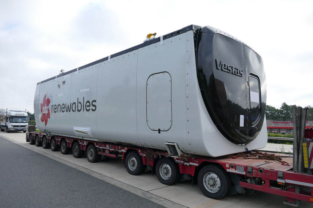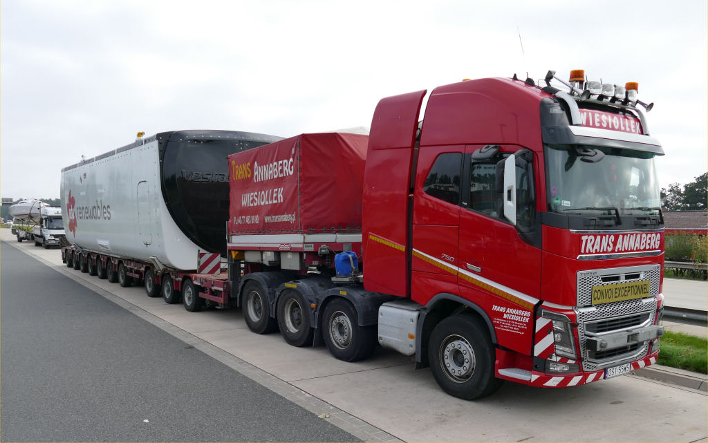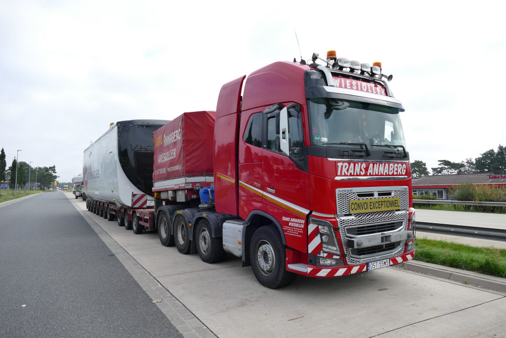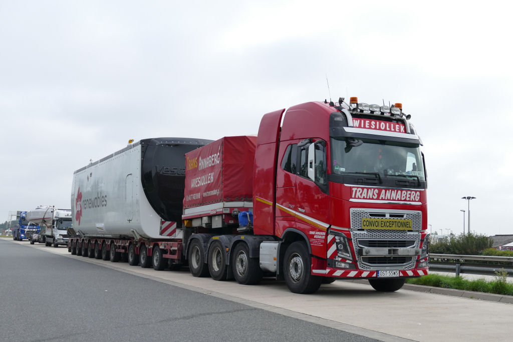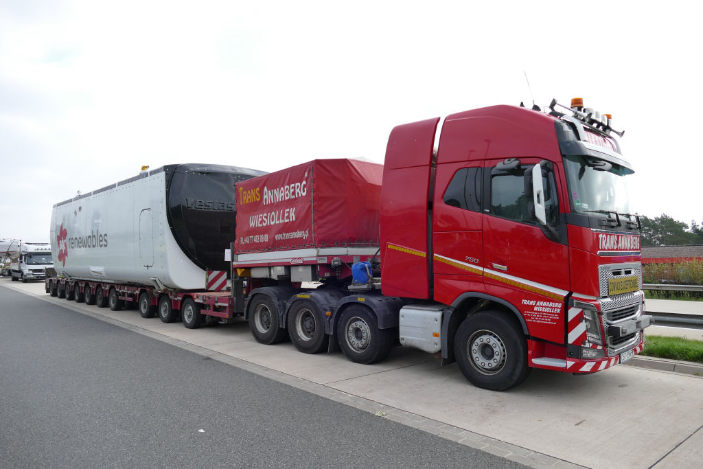 Volvo FH 16 750 8x4 mit Nooteboom Manoovr 3-7 Semitieflader und Vestas V 136 Gondel.