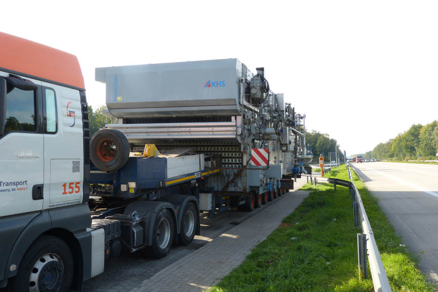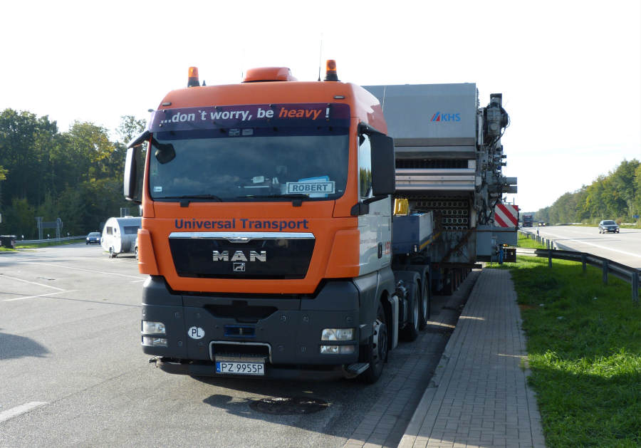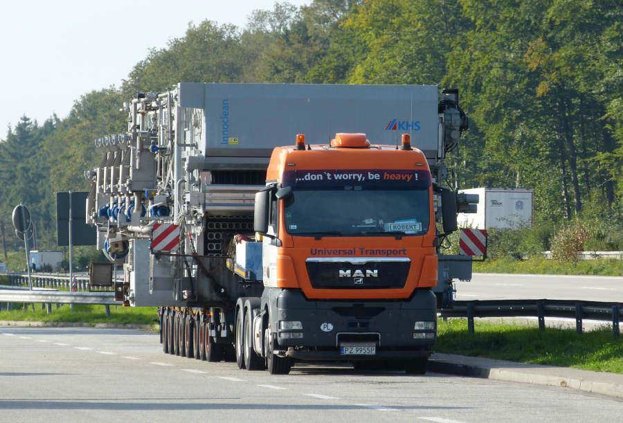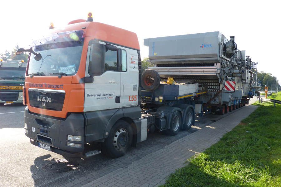 Als Zugmaschine kam eine MAN 26.480 TGX XLX und als Auflieger ein achtachsiger Semitieflader,