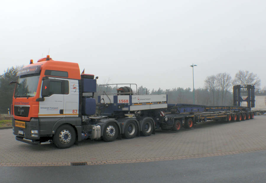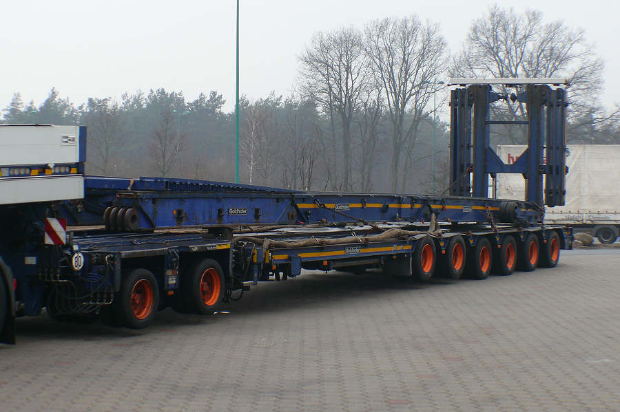 Es handelte sich um einen Spezialtransporter für den Transport von langen Eisenbahnwaggons, bzw.