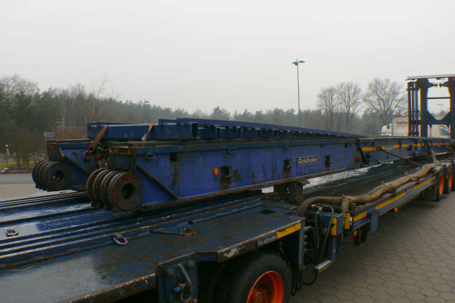 Auf der Ladefläche, der Rampe und der auf dem Transport verladenen Verlängerung, befinden sich Schienen in verschiedenen