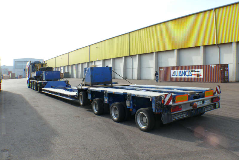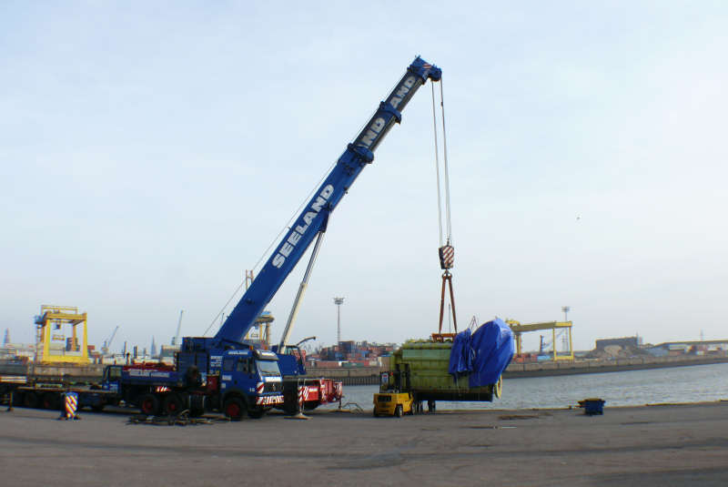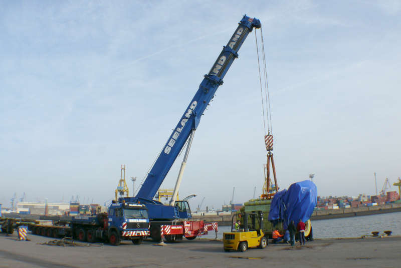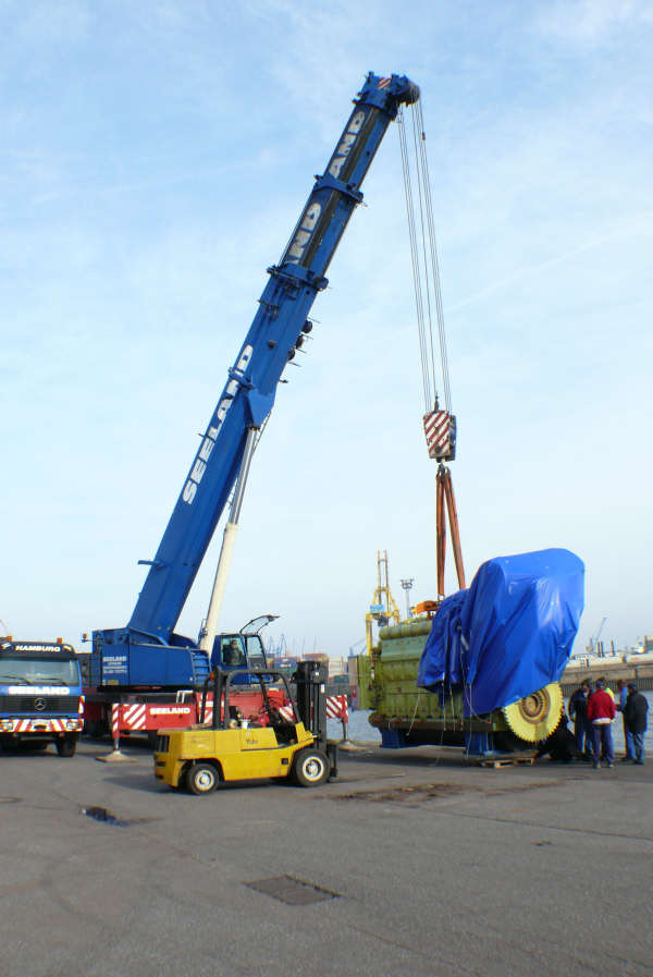 Der Motor wird mit Stützfüßen versehen und bis zum Weitertransport auf dem Kai gelagert.