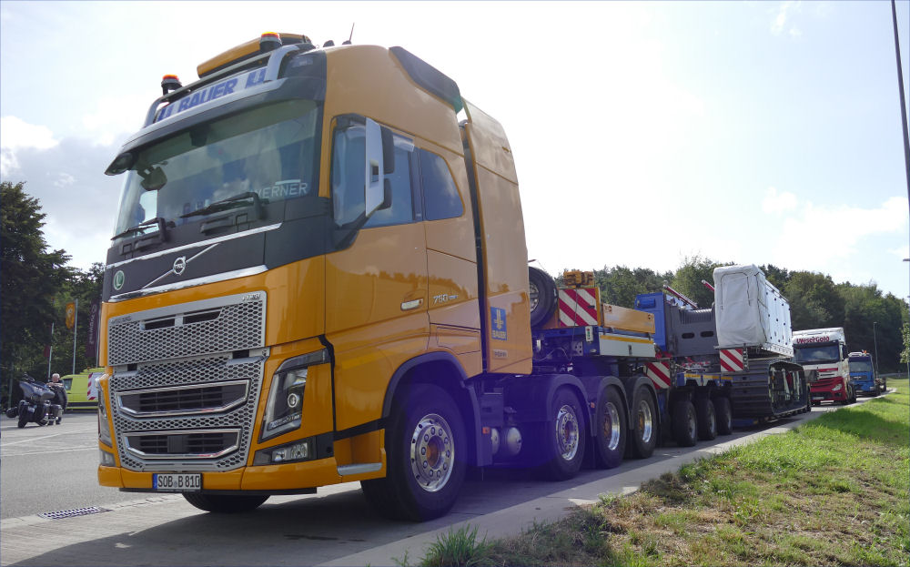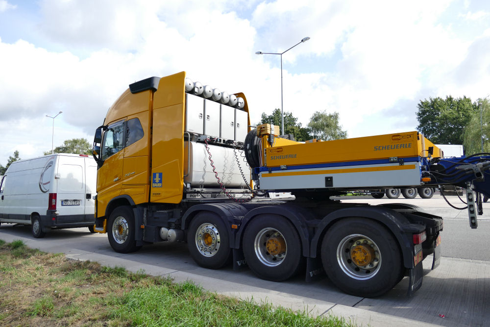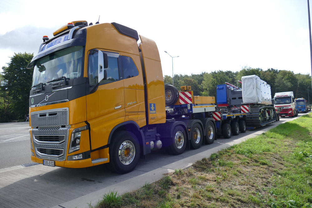 Die Transportkombination bestand aus Volvo FH04 750 8x4 mit Scheuerle Eurocompact 3-5 Satteltieflader.