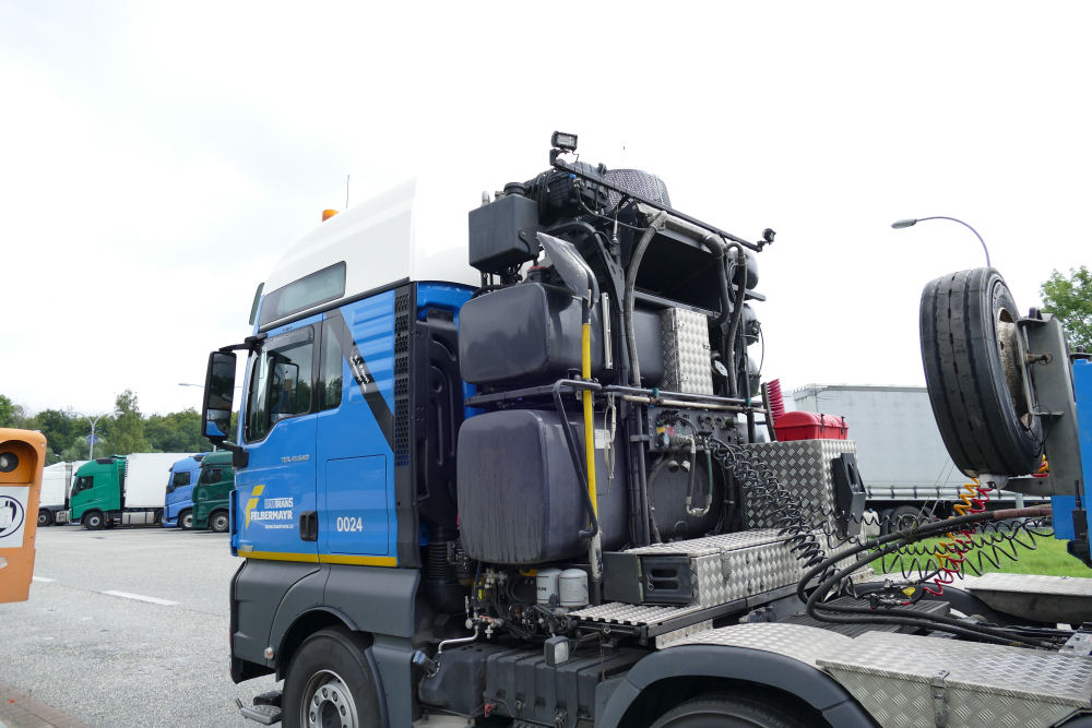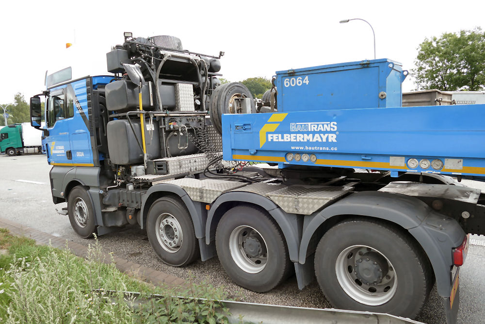 Die Transportkombination bestand aus MAN 41.640 TGX mit achtachsigem STZ-H8, Goldhofer Semitieflader