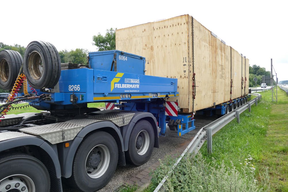 Es wurde eine 65 t schwere Maschinenkiste für den Export nach Rußland transportiert.