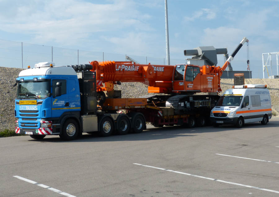 Eine Scania R 560 8x4 mit Goldhofer sechsachs Semitieflader hatte einen Liebherr LTR 1100