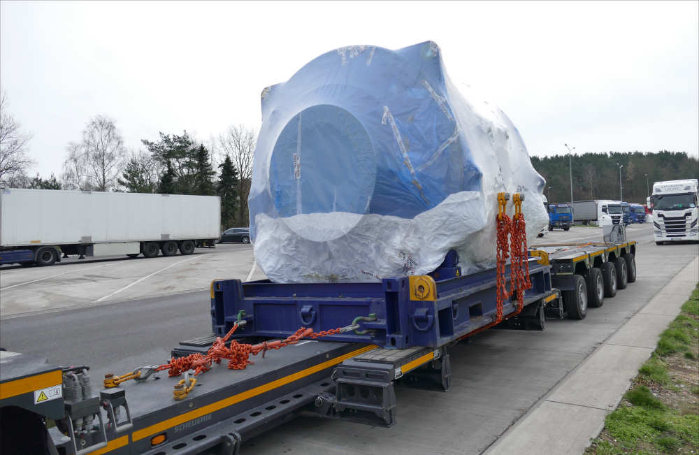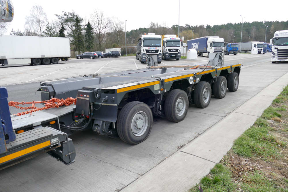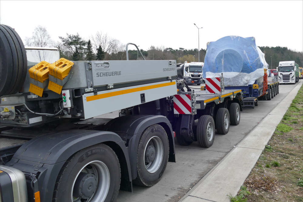 Bei diesem Transport war die Konfiguration 3-5 mit Baggerbrücke, auf der ein Windenergieanlagen Getriebe