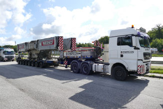 Transporteinheiten von Enercon waren zwei MAN 33.540 mit achtachs Semitieflader und eine MB 4160 Actros MP 3 Titan