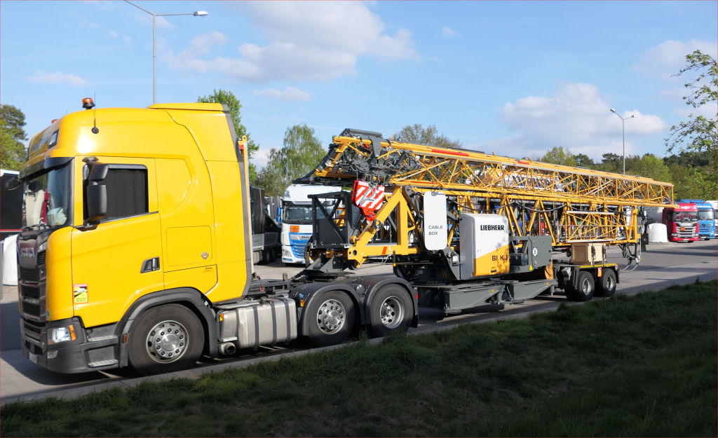 Es wurde ein Liebherr 81 K.1 Schnellbaukran als Sattelauflieger Schnellläufer transportiert.