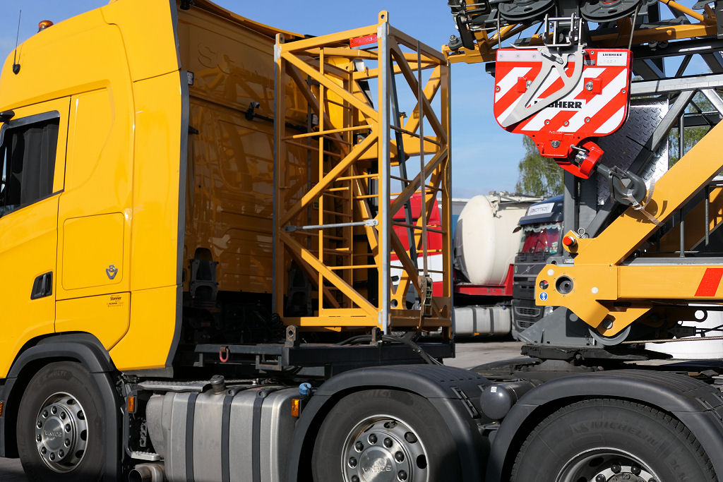 Interessant war an der Zugmaschine, das dort eine Halterung zum Transport von Turmverlängerungen
