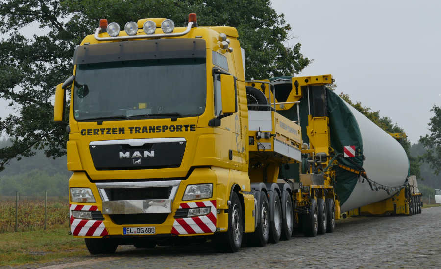 MAN 41.680 TGX mit Goldhofer THP 3/5 Rohradapter Kombination und Enercon WEA Turmteil
