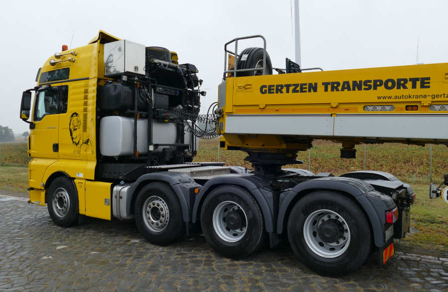 Die Schwerlastkombination bestand aus MAN 41.680 TGX 8x4 Zugmaschine mit Goldhofer THP/ET 3/5