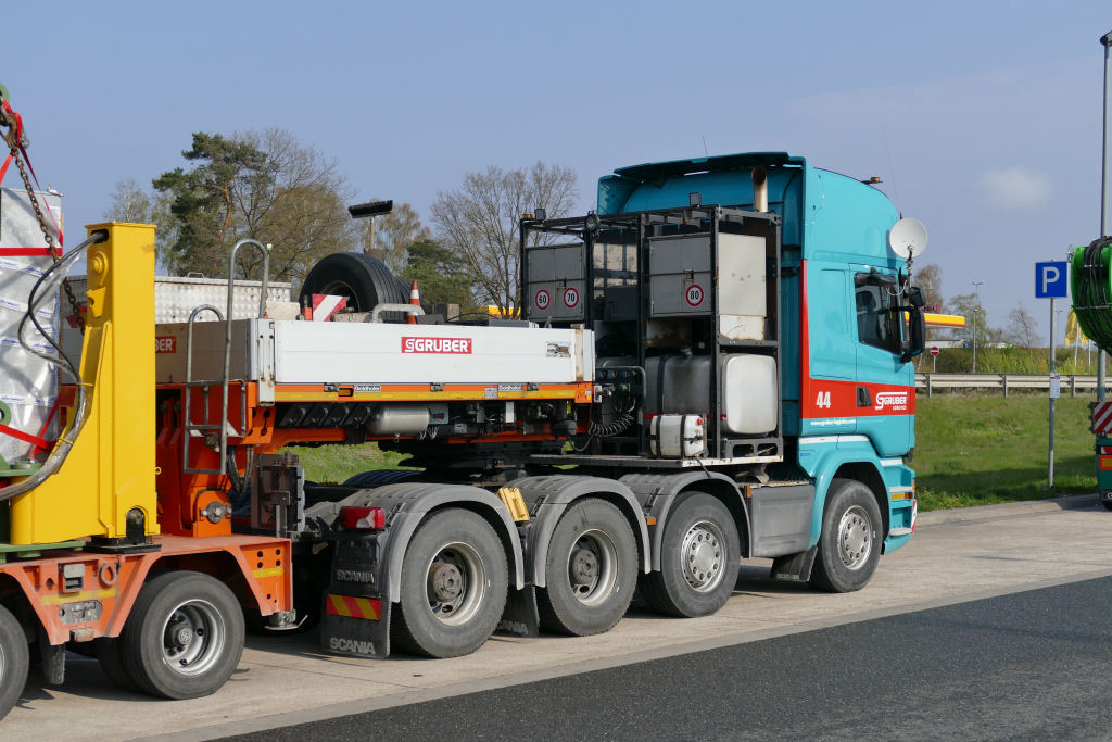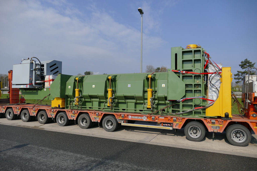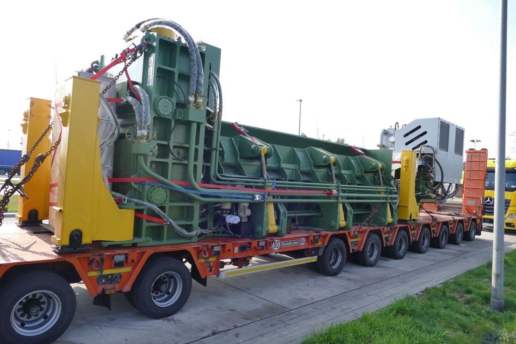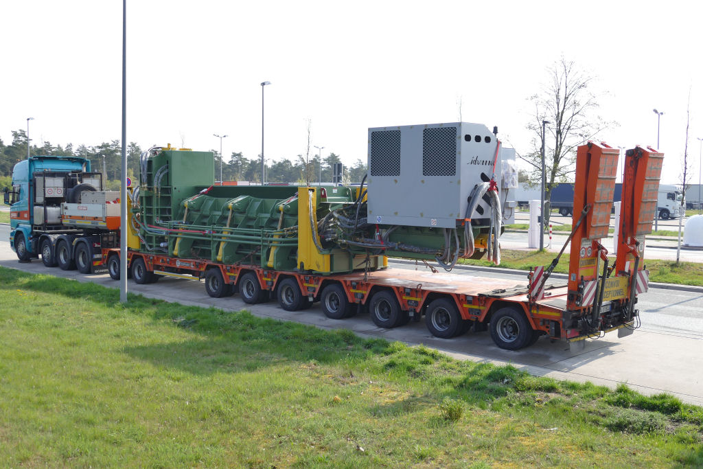 Scania R 580 8x4 mit Goldhofer MPA 9 (2+7) Semi Tieflader und Teil einer Schrottpresse