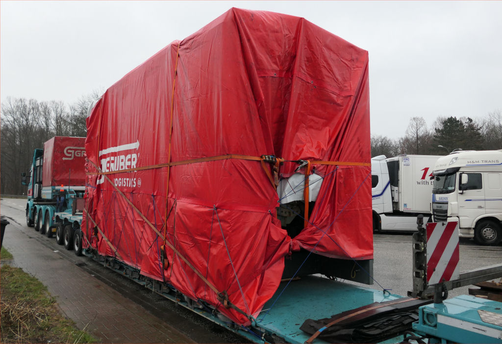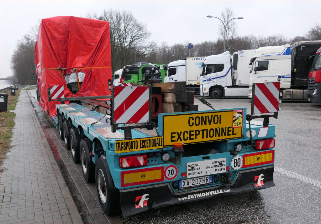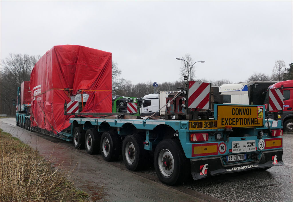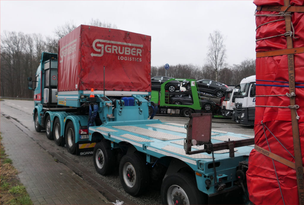 Scania R 730 8x4 mit Faymonville Variomax 3-5 Tieflader und Getriebe unter Plane