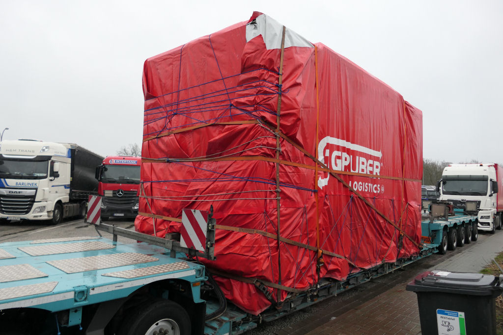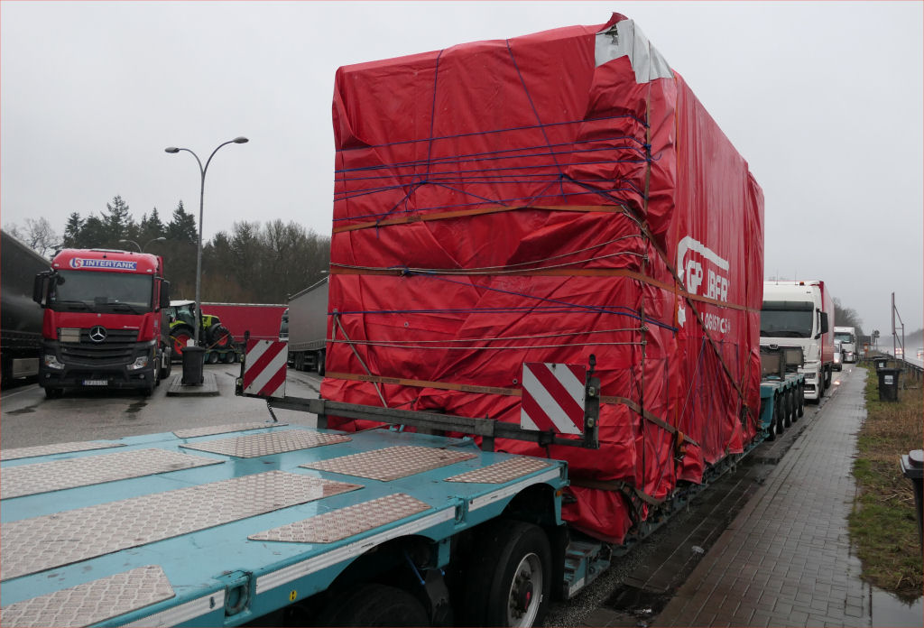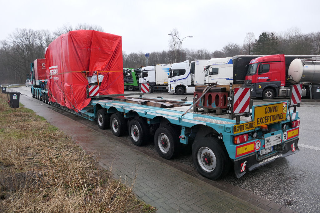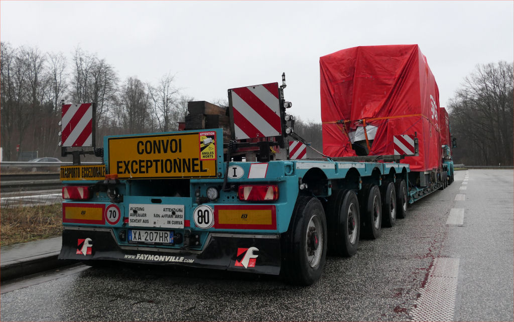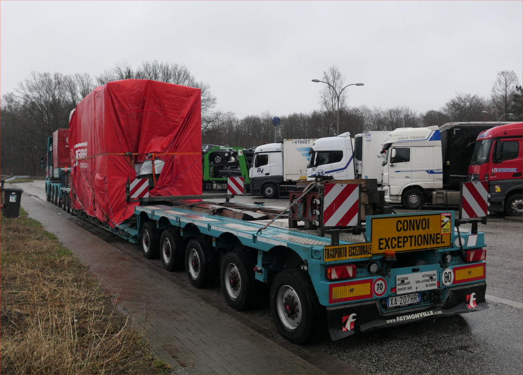 Scania R 730 8x4 mit Faymonville Variomax 3-5 Tieflader und Getriebe unter Plane