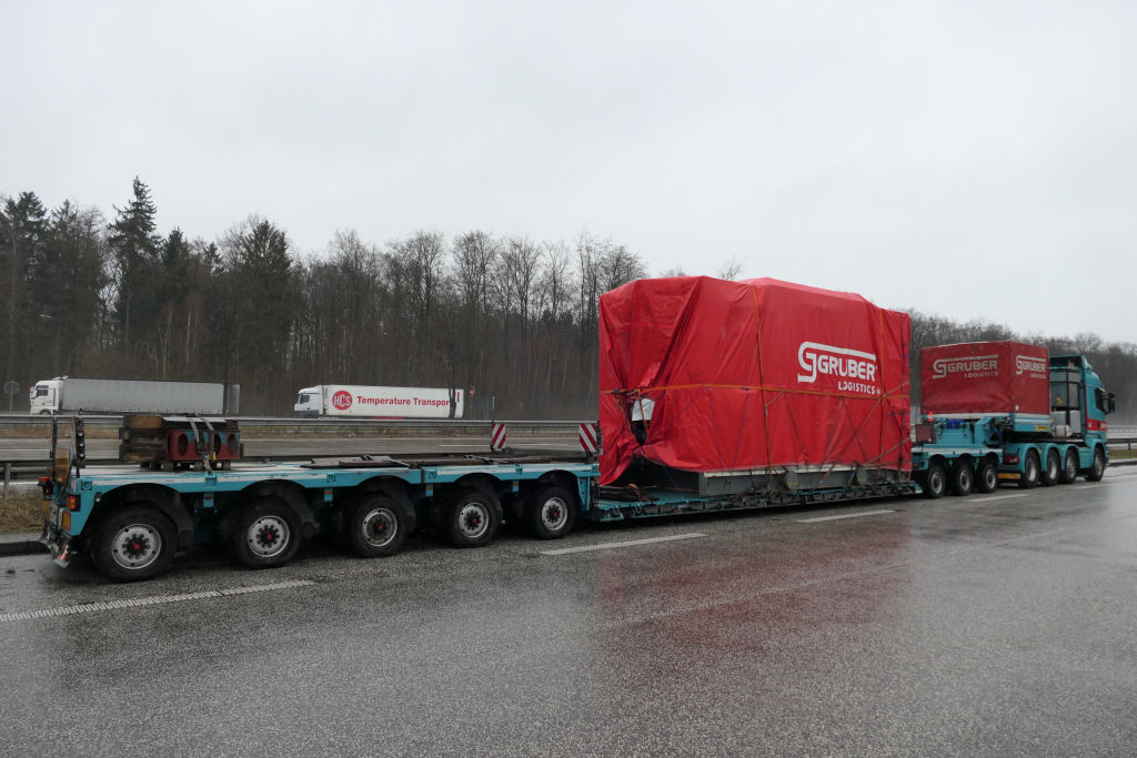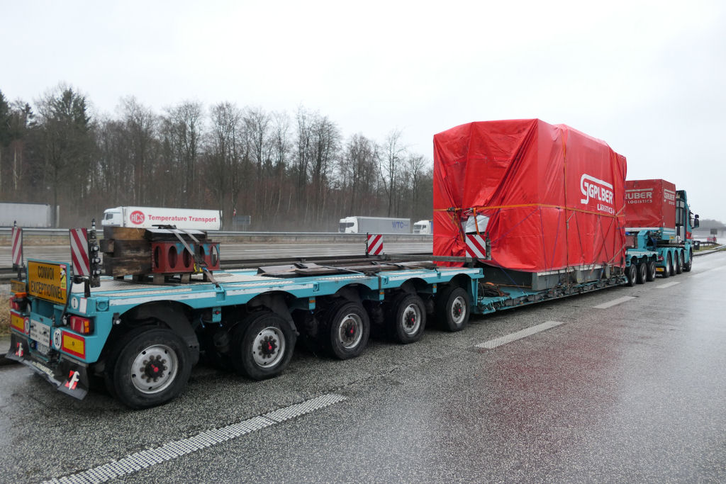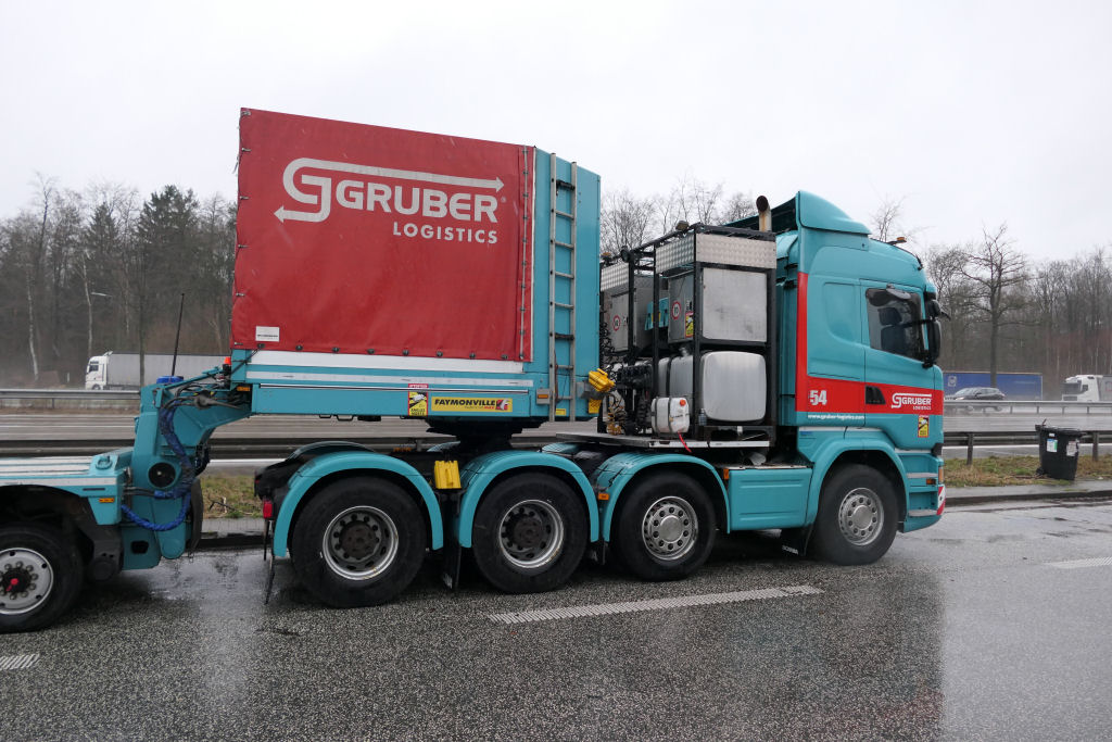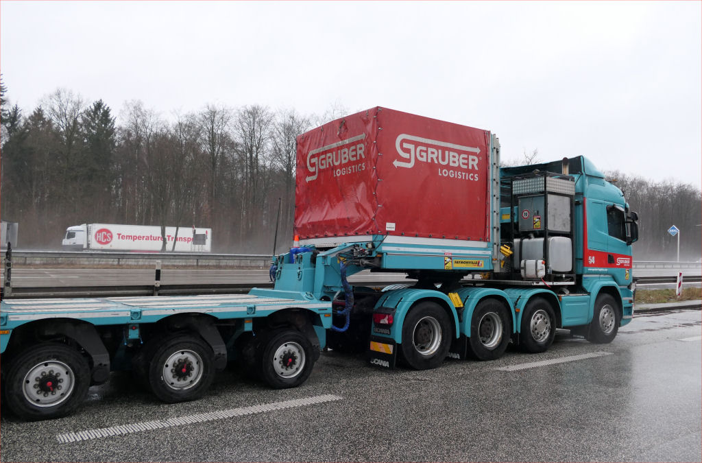 Scania R 730 8x4 mit Faymonville Variomax 3-5 Tieflader und Getriebe unter Plane