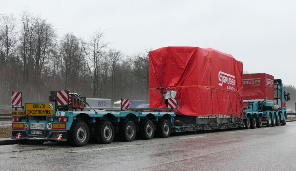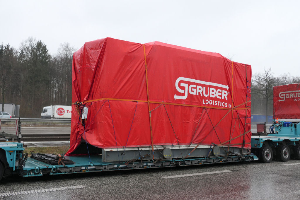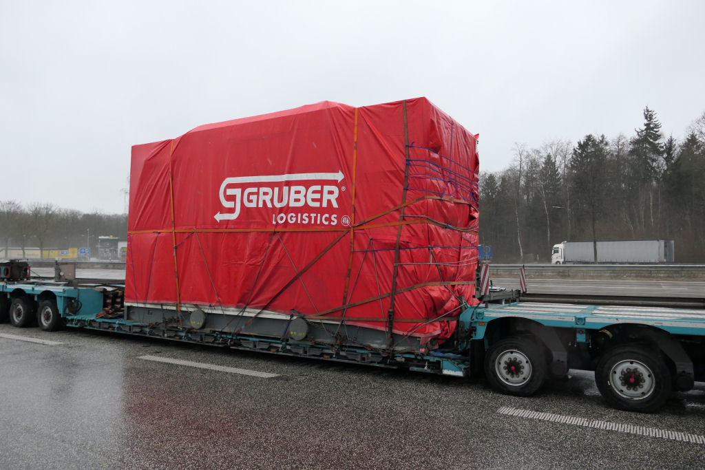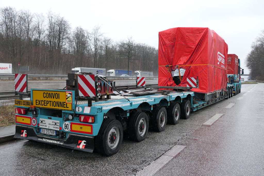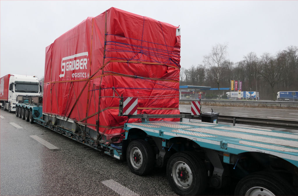Scania R 730 8x4 mit Faymonville Variomax 3-5 Tieflader und Getriebe unter Plane