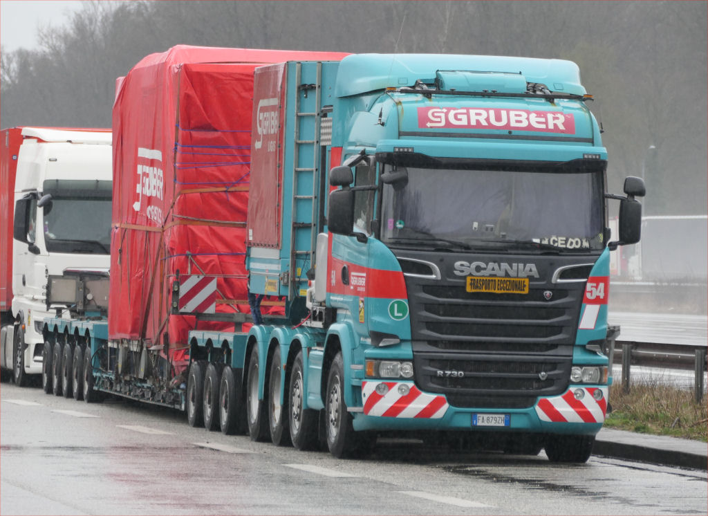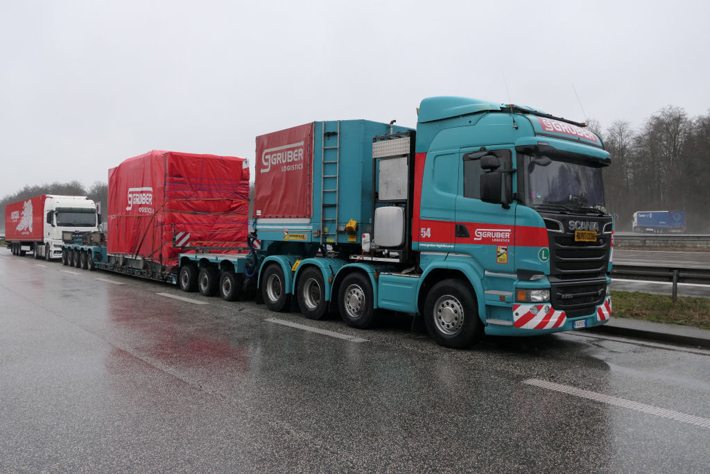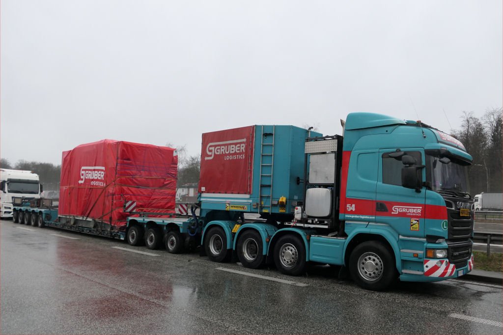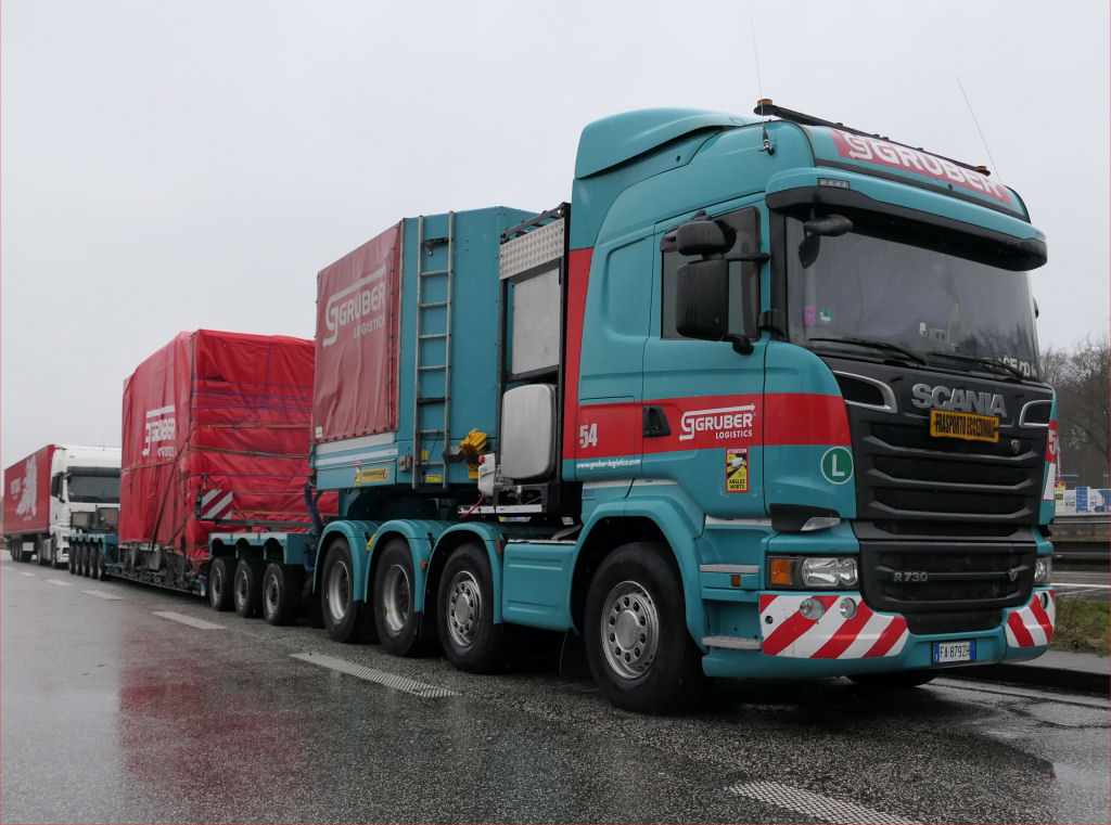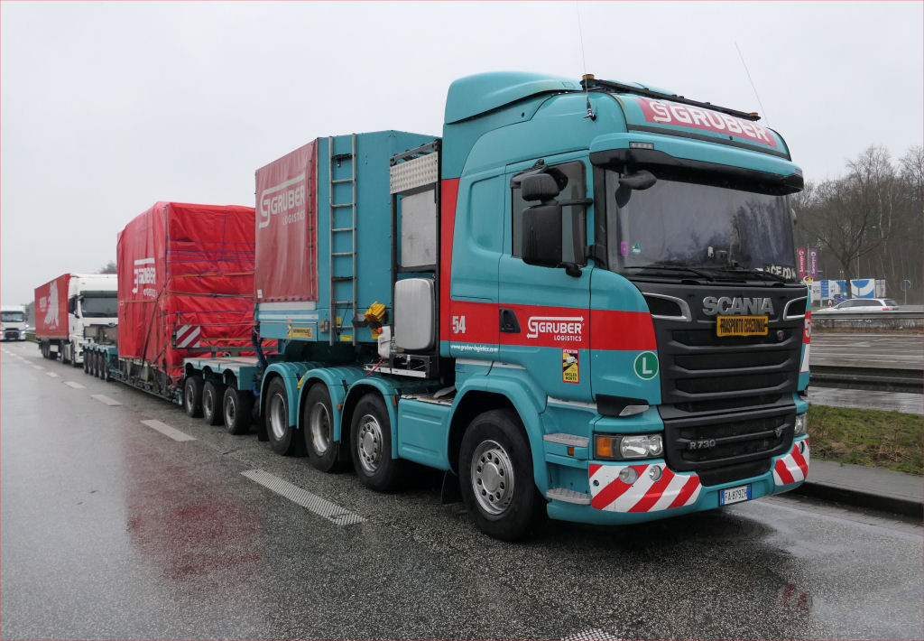 Scania R 730 8x4 mit Faymonville Variomax 3-5 Tieflader und Getriebe unter Plane