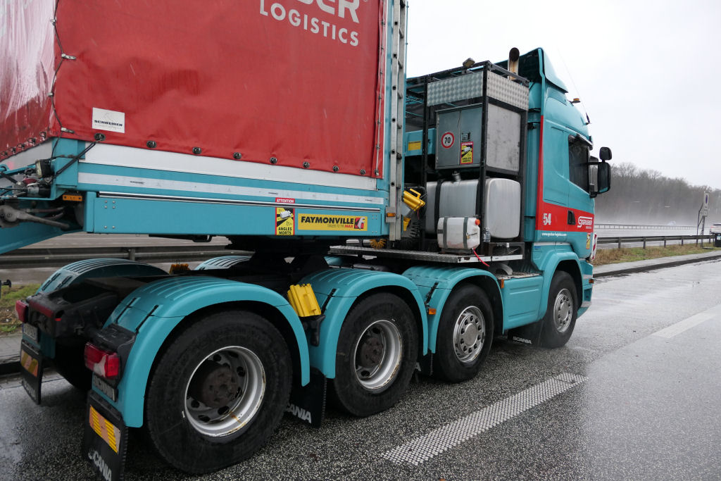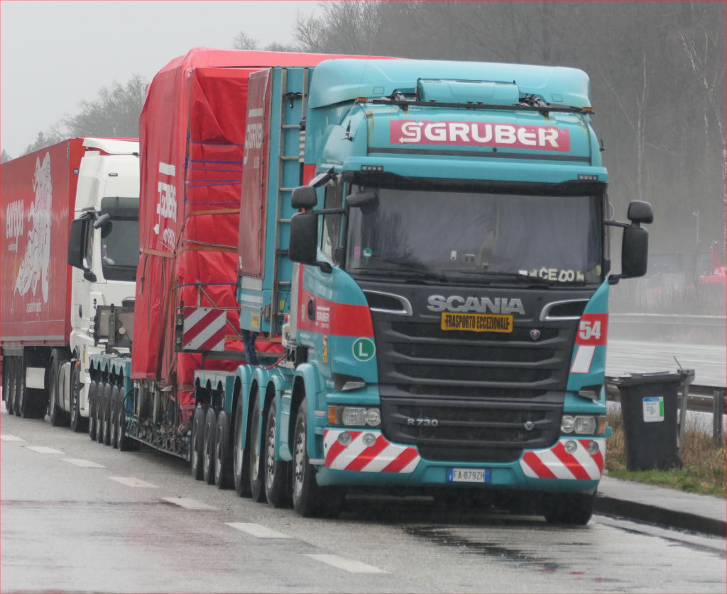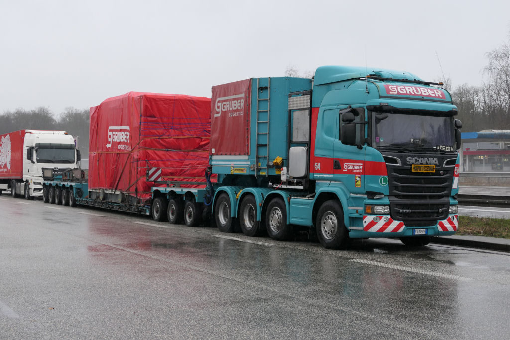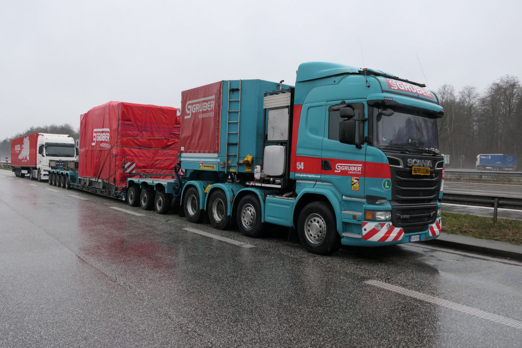 Scania R 730 8x4 mit Faymonville Variomax 3-5 Tieflader und Getriebe unter Plane