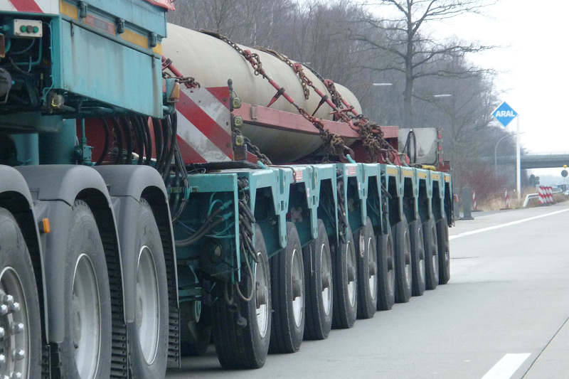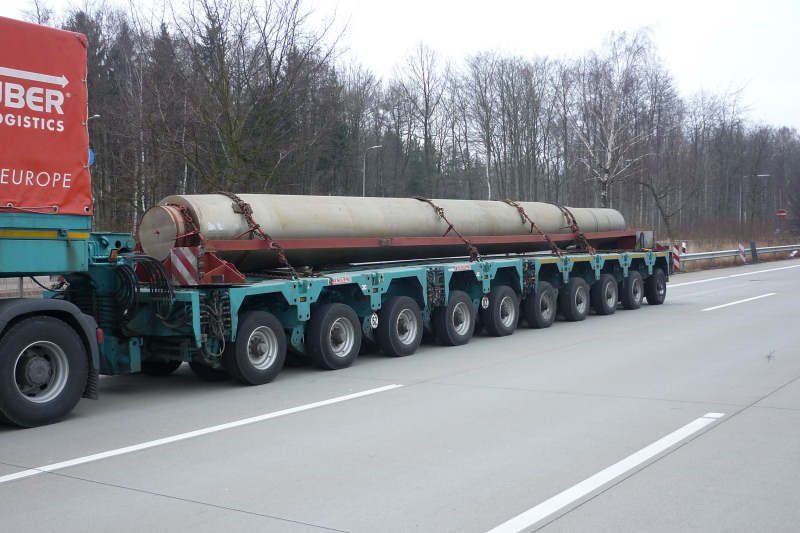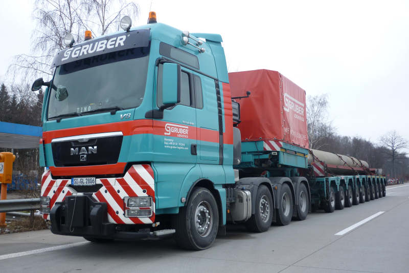 Die Kombination bestand aus MAN 41.680 TGX und zehnachsigem Scheuerle Eurocombi Sattelroller.