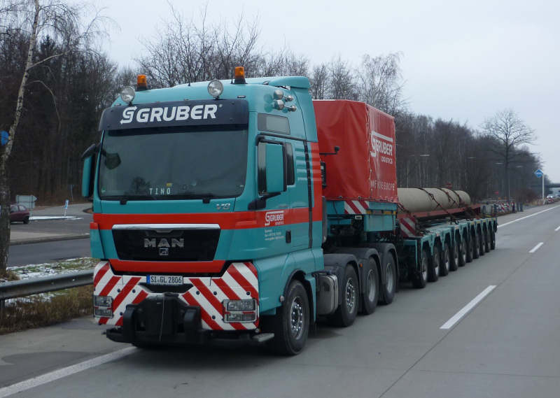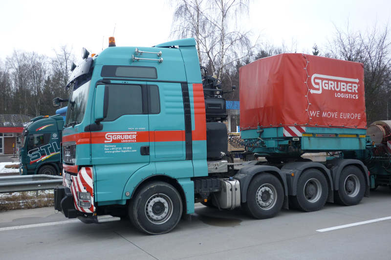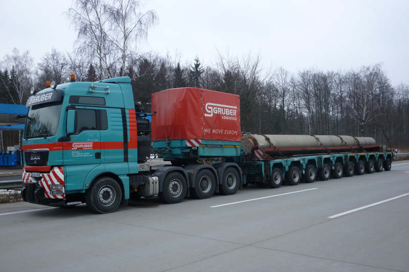 Mitte Februar 2011 stand dieser Transport von Gruber Logistics auf der Schwerlastspur der Raststätte Buddikate West, an der A1.