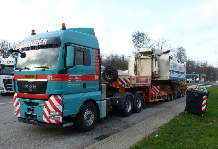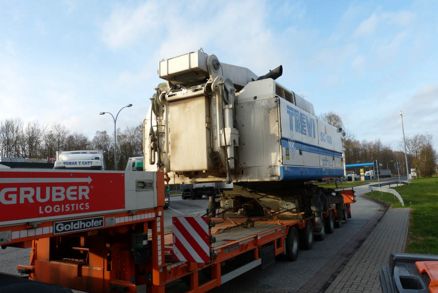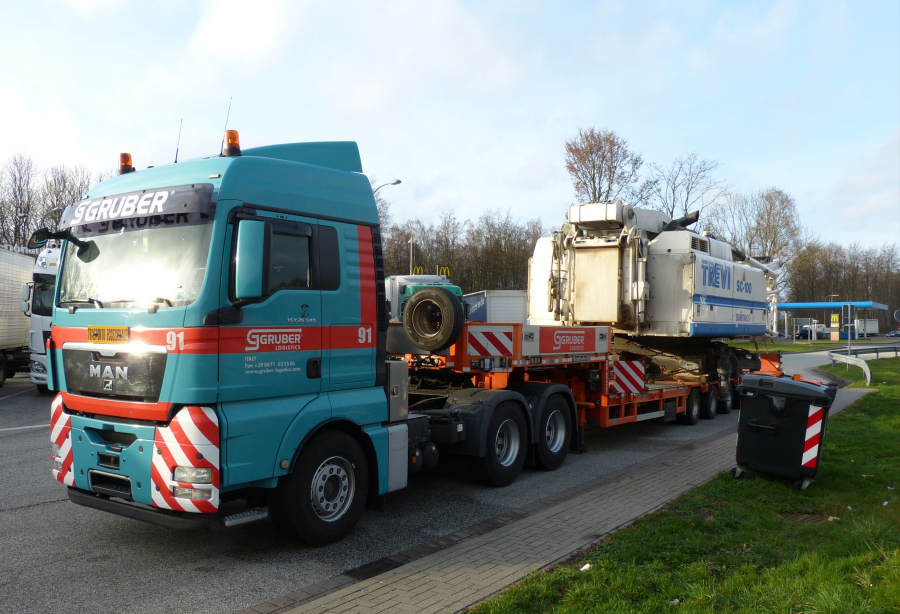 Eine MAN 26.540 TGX mit Goldhofer sechsachs Semitieflader hatte als Fracht ein Soilmec SC-100
