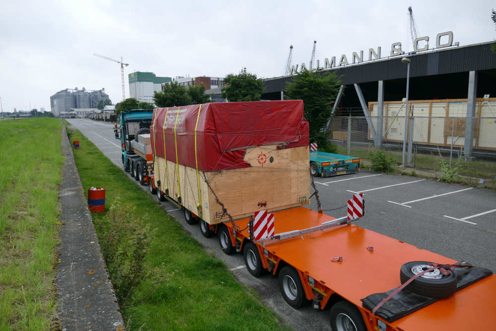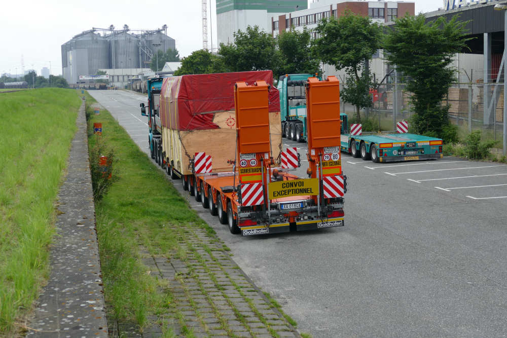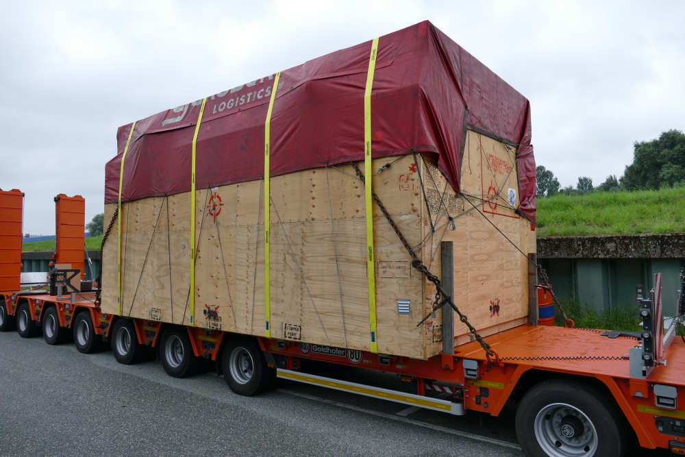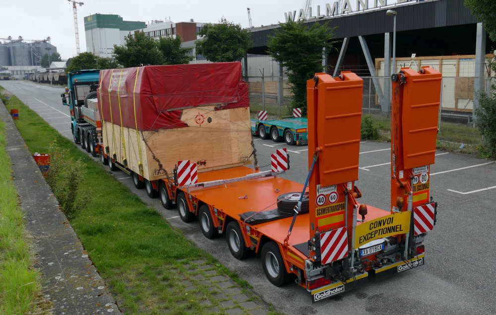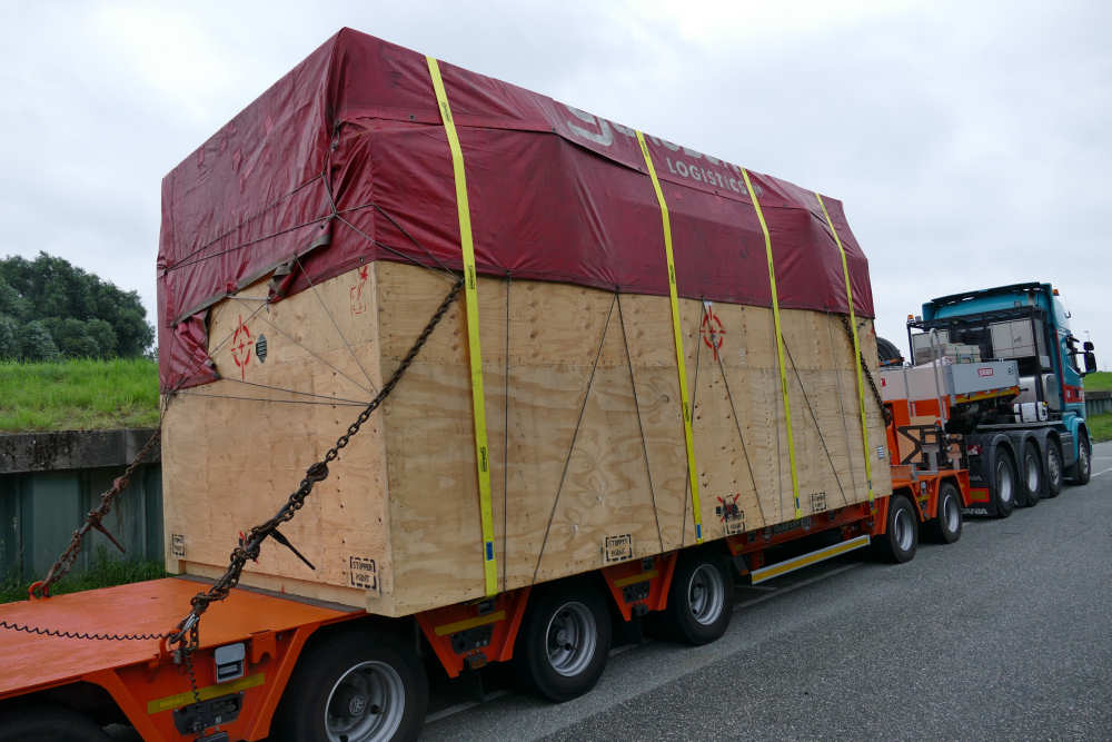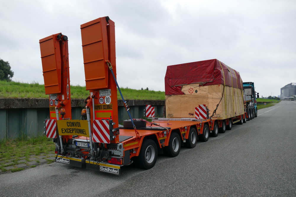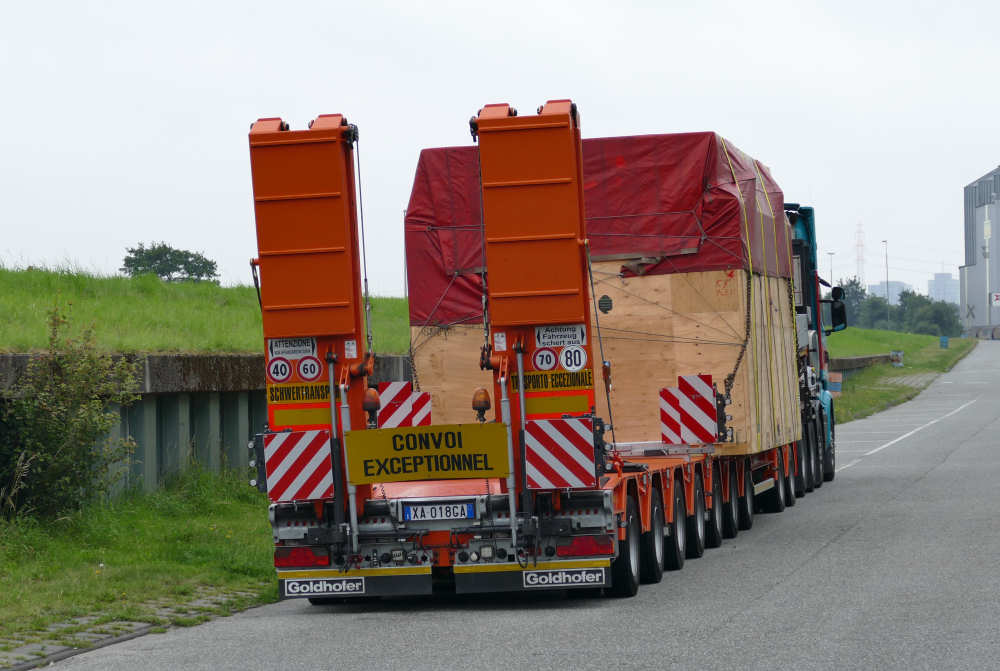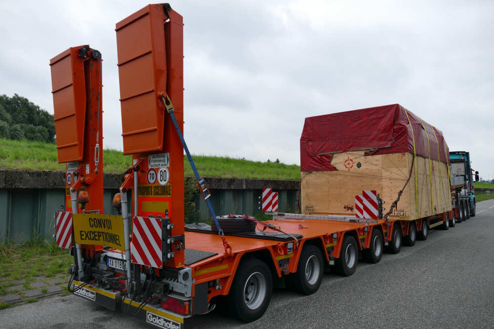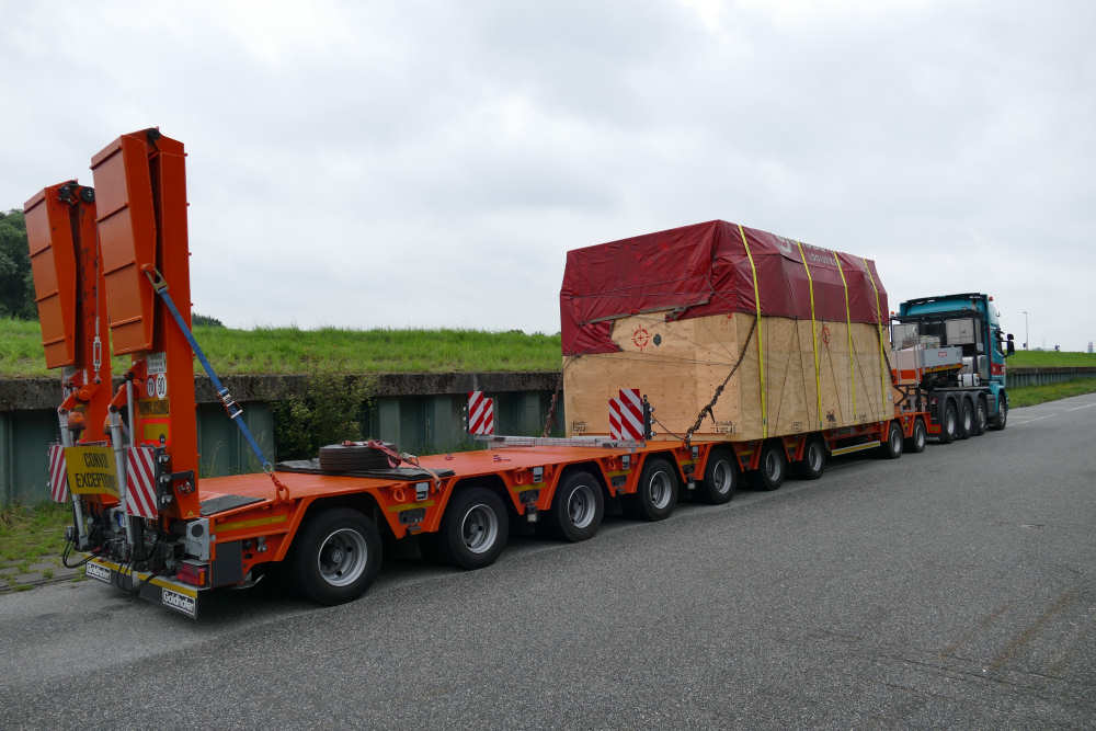 Scania R 580 8x4 mit Goldhofer MPA 9 (2+7) Semi Tieflader und Maschinenkiste