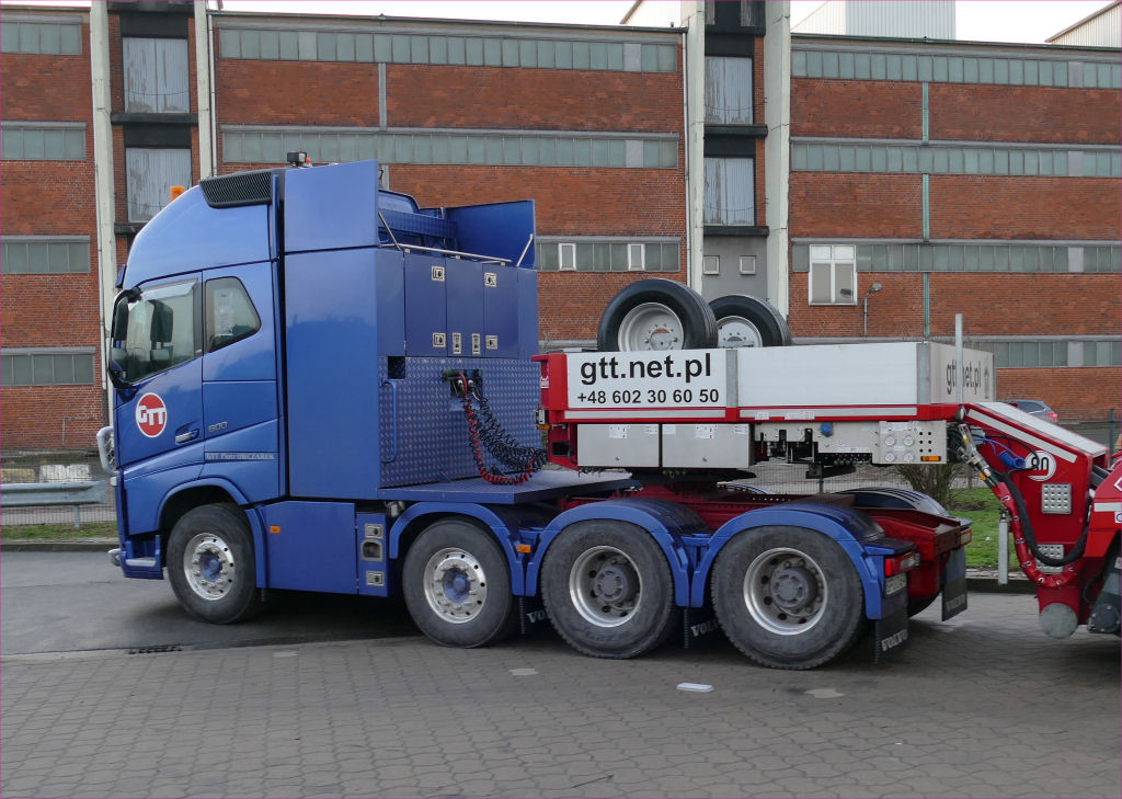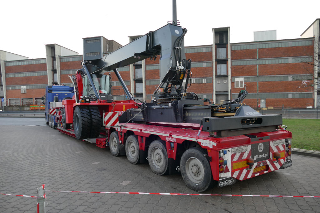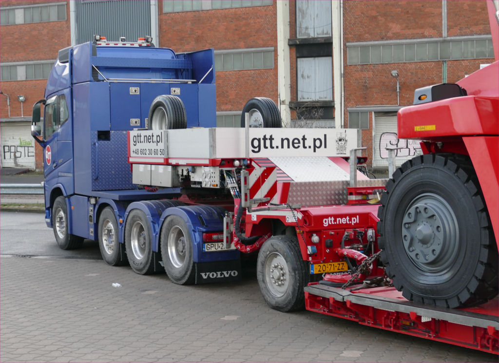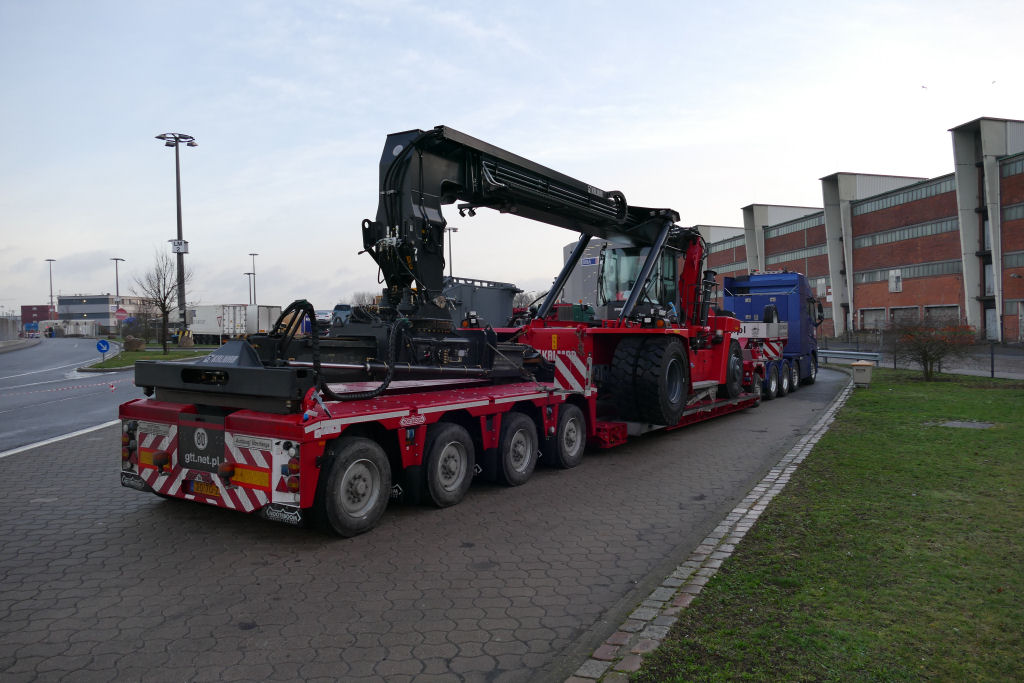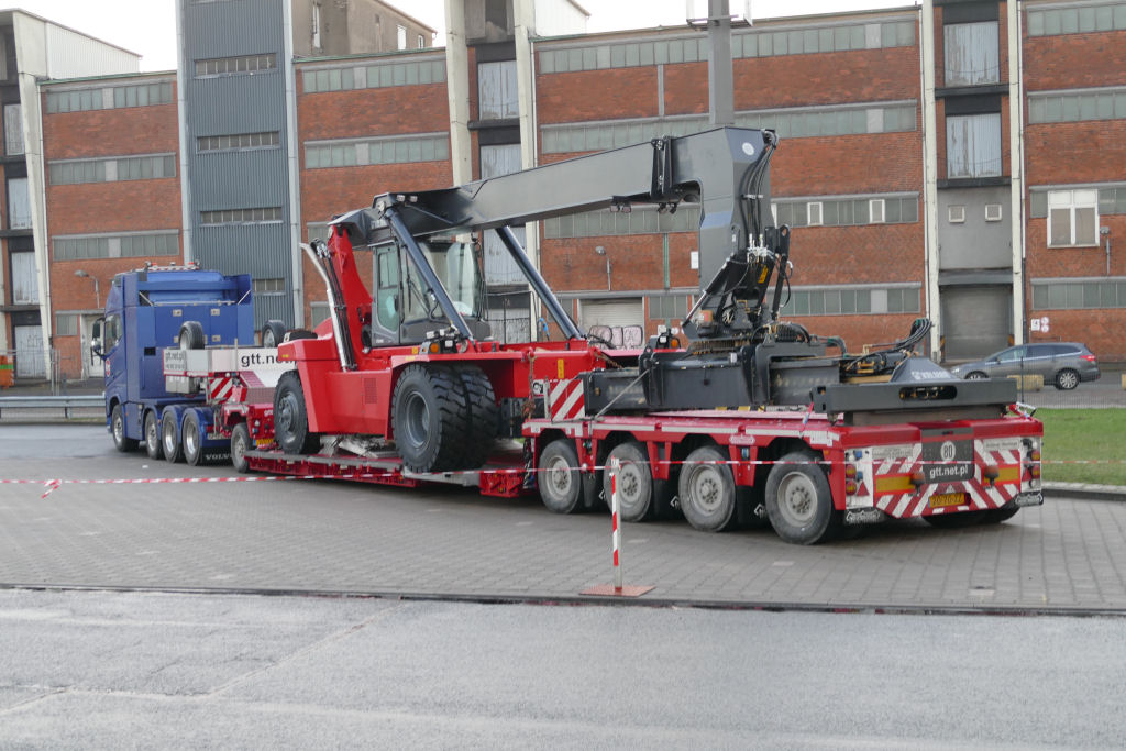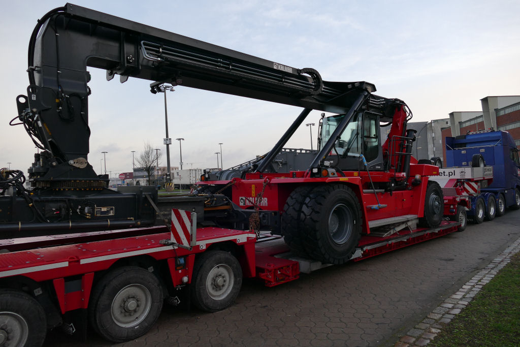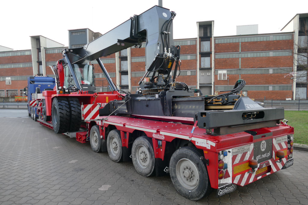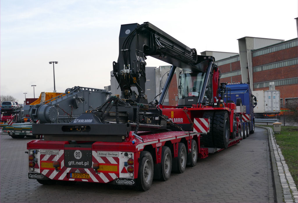 Volvo FH 04 mit Nooteboom 1-4 Tieflader und Kalmar Reachstacker