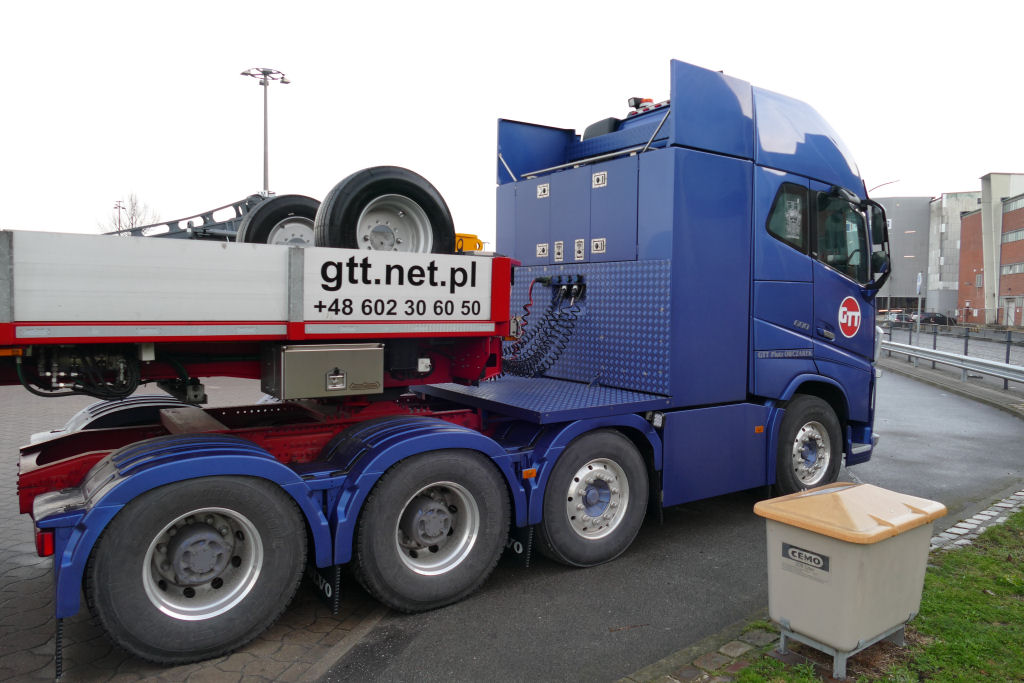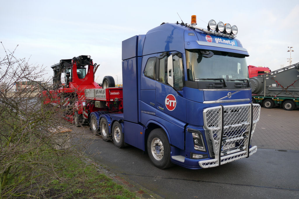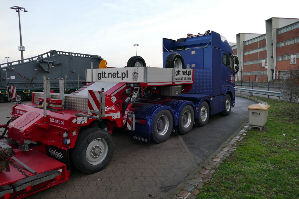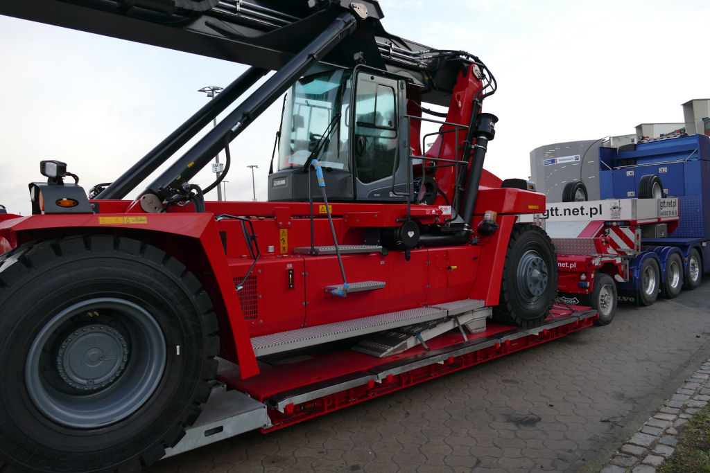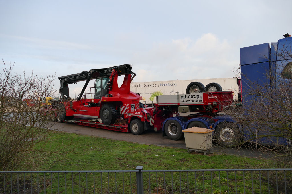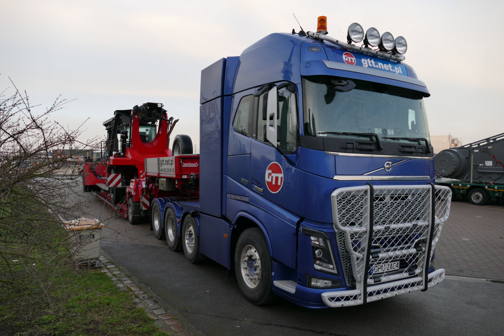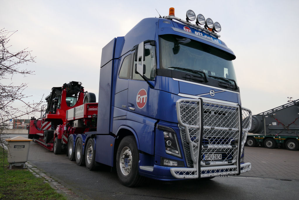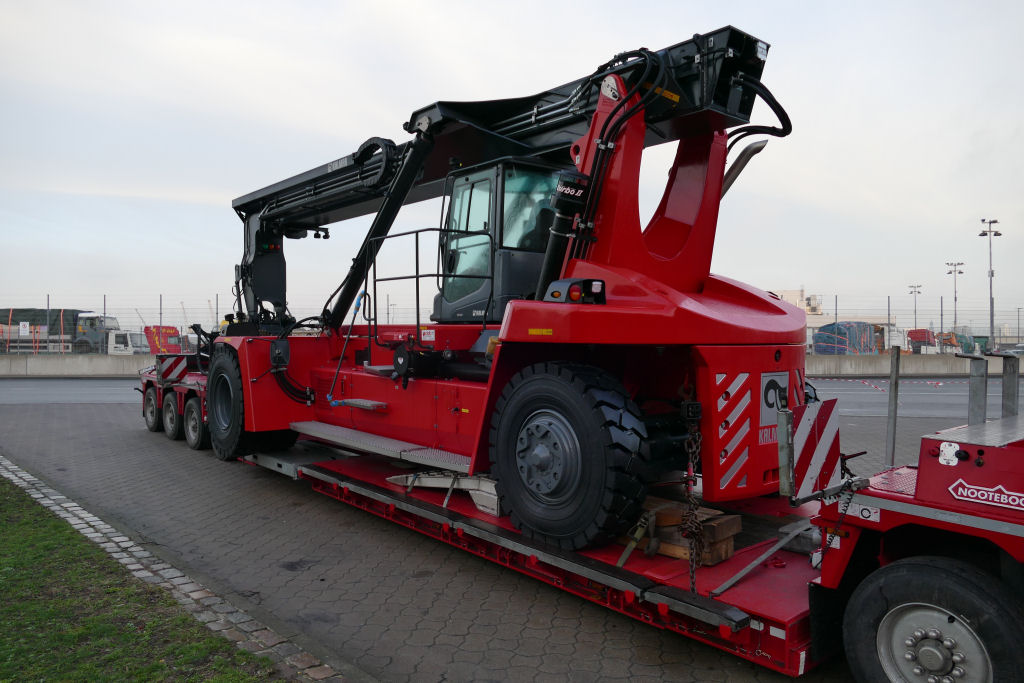 Volvo FH 04 mit Nooteboom 1-4 Tieflader und Kalmar Reachstacker