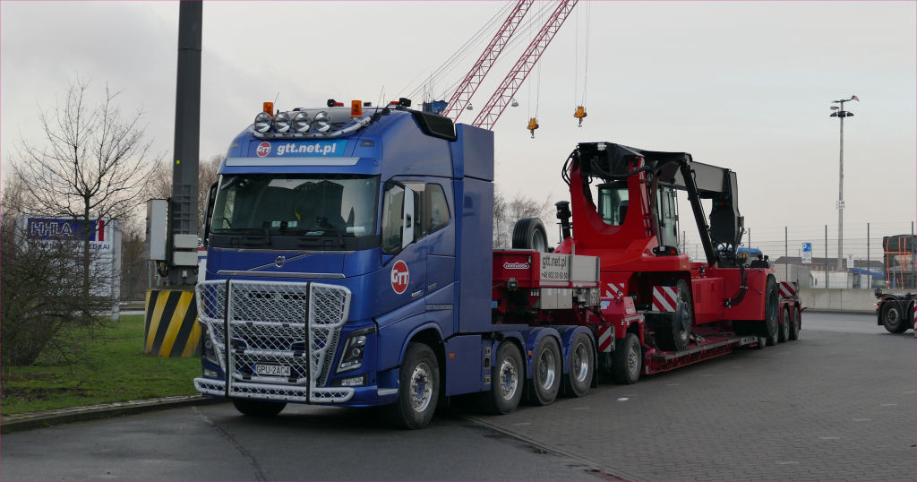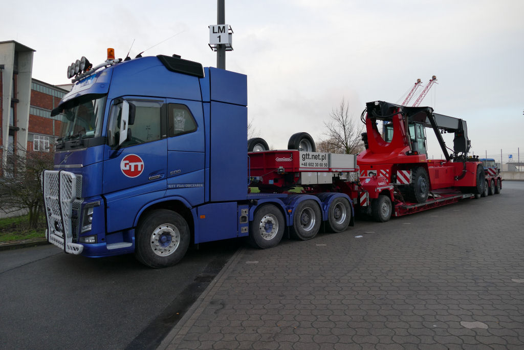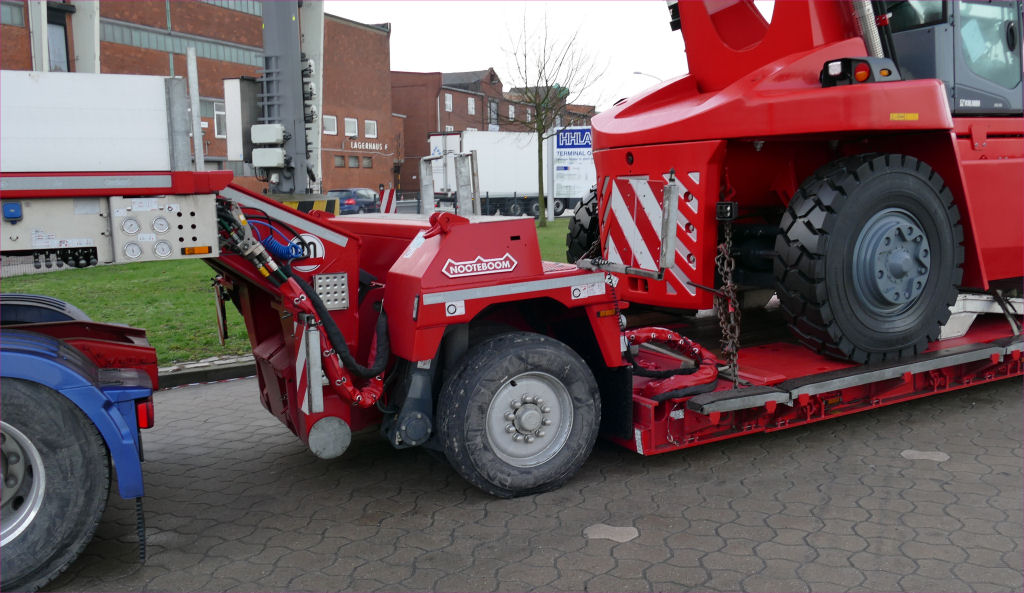 Volvo FH 04 mit Nooteboom 1-4 Tieflader und Kalmar Reachstacker