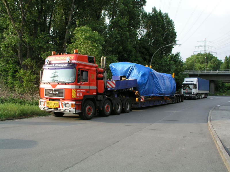Ein Transport auf dem Autohof HH Altenwerder im Jahr 2004, MAN 41.502 mit Nooteboom Tiefbett (ehemals bei Juhl gelaufen)