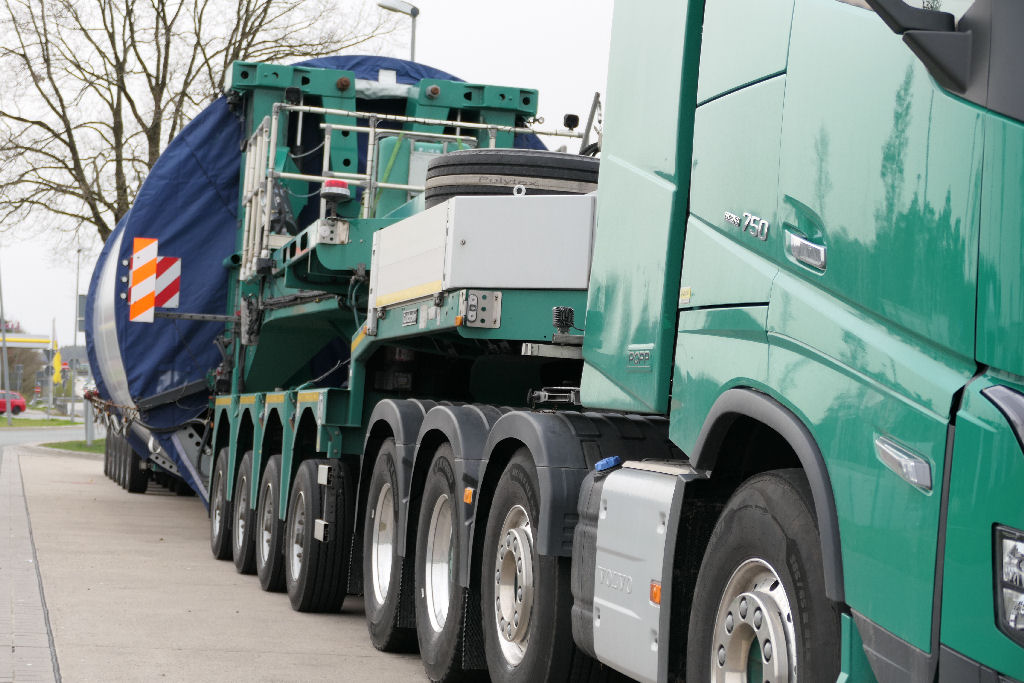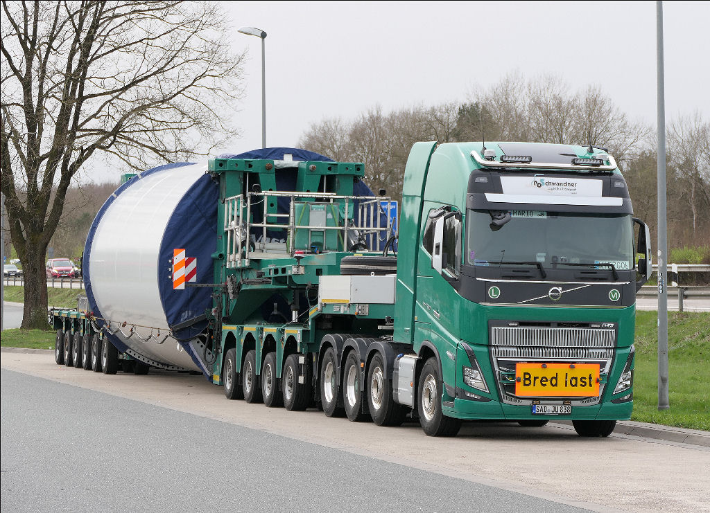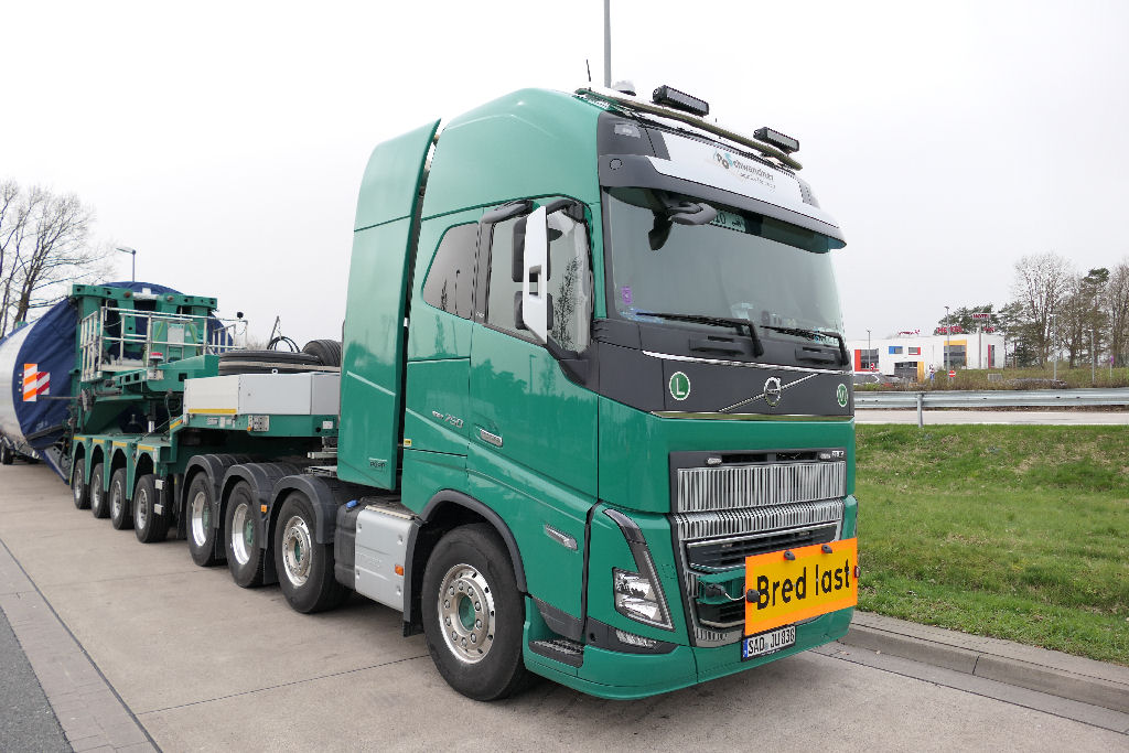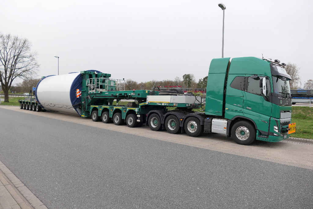 Volvo FH 16 750 8x4 mit Goldhofer RA2-110 Rohradapterkombination und WEA Turmsektion