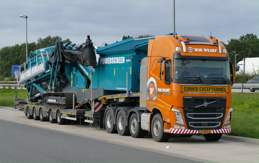 Volvo FH 04 8x4 mit Broshuis 5 achs Semitieflader und Powerscreen Siebanlagen Transport