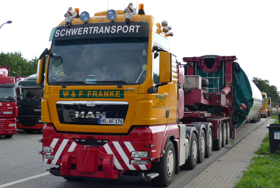 war im September 2015 mit einem WEA Turmteil als Ladung auf Buddikate, an der A 1 zu sehen.