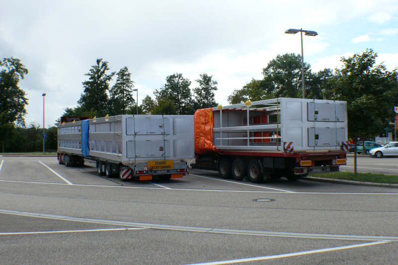 Zwei Transporte mit Konstruktionsteilen auf dem Rasthof Mahlburg West an der A 5, September 2009.