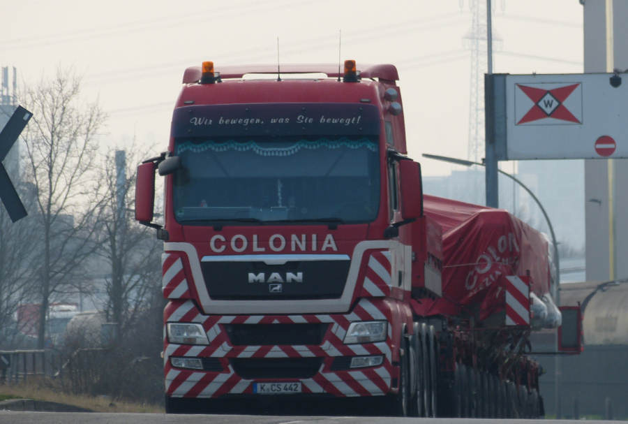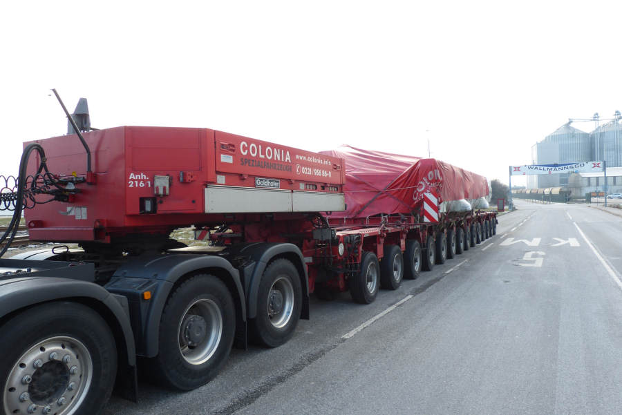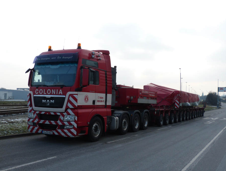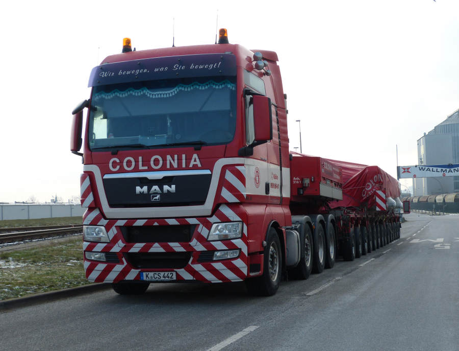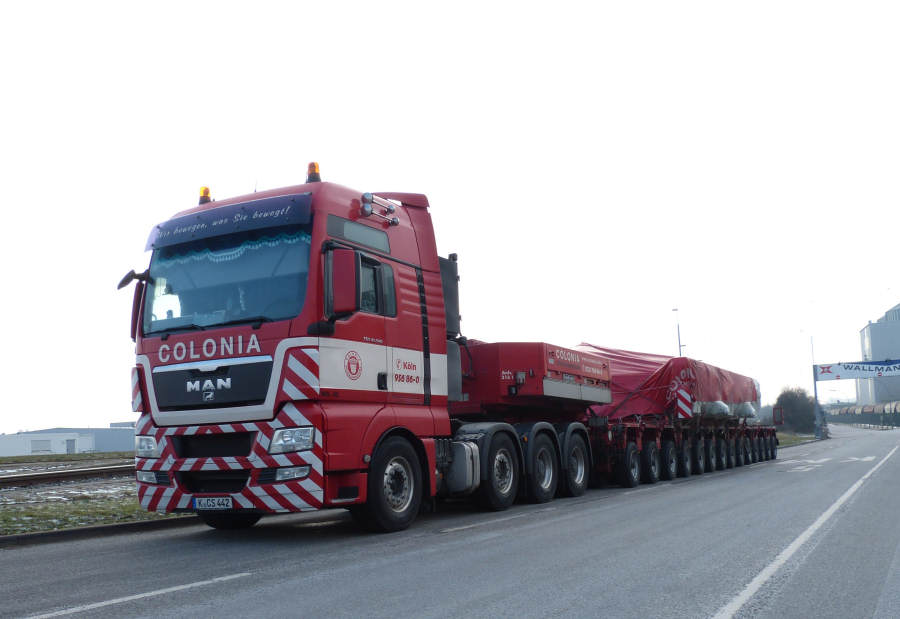 Ende Januar 2014 lieferte Colonia ein schweres Maschinenteil, unter Plane, an einem Hafenterminal