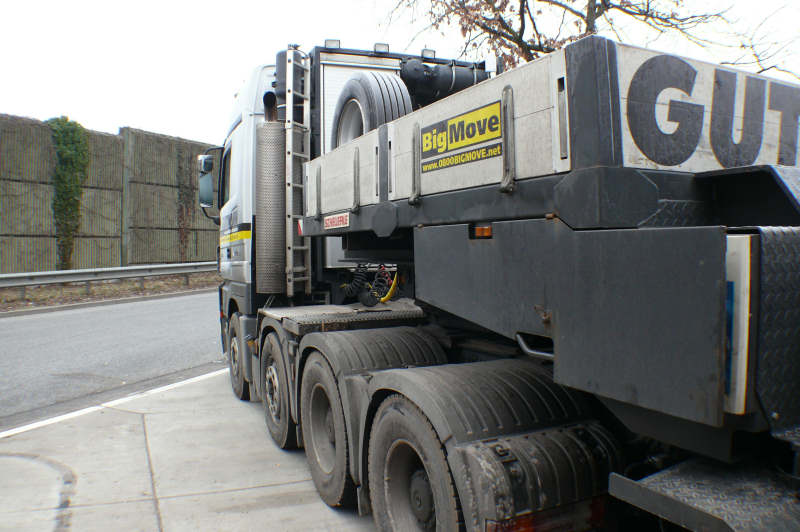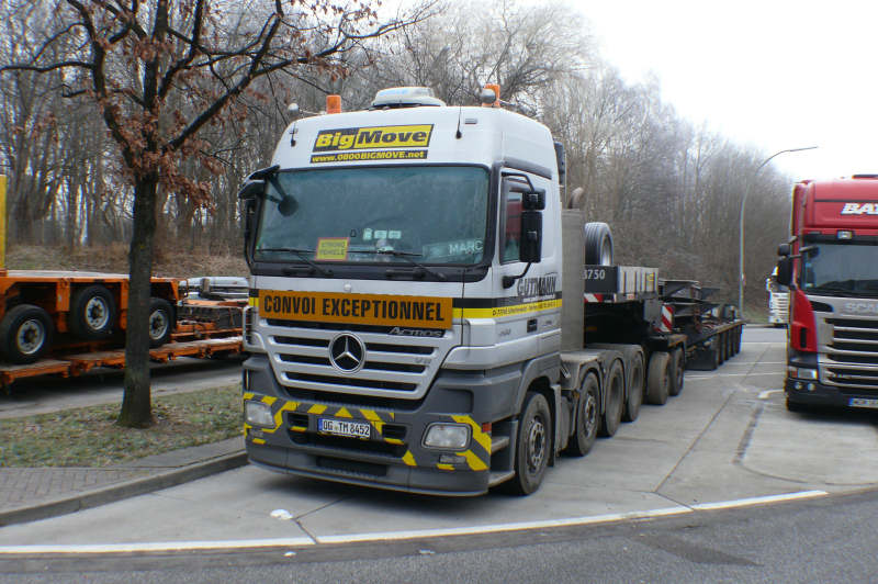 Die Zugmaschine ist eine MB 4160 MP 2 Titan, die Tiefladerkombination von Scheuerle.