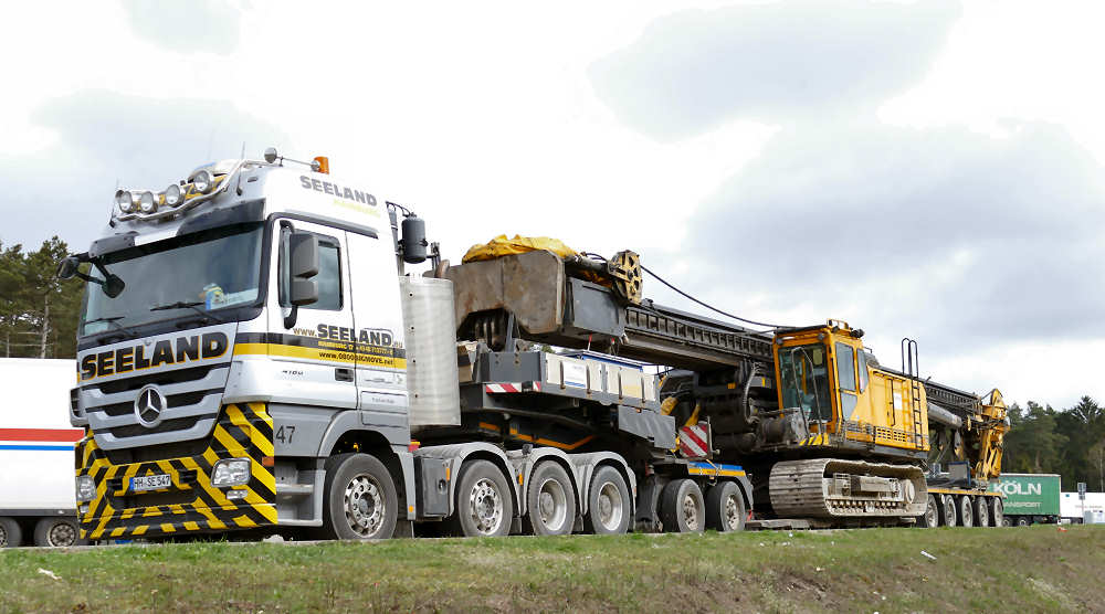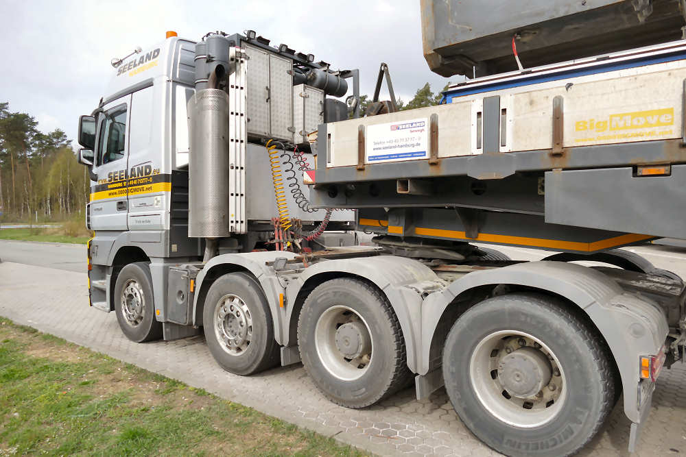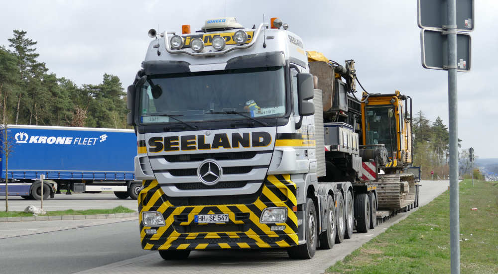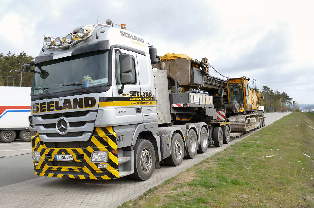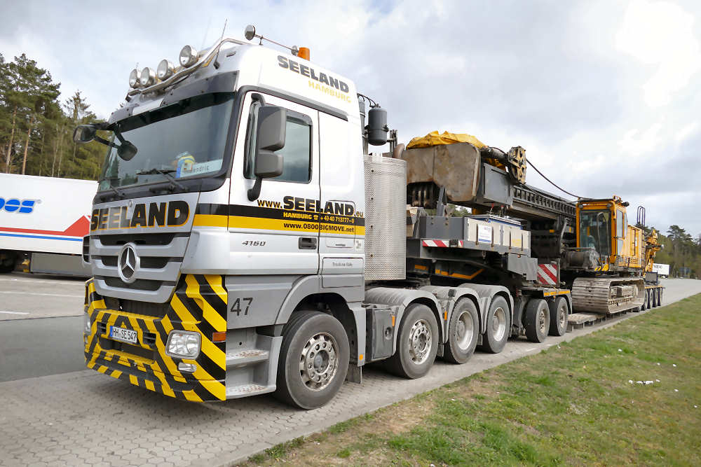 Im April 2017 stand dieser Transport von Seeland mit der silbernen MB 4160 MP 3 Titan und einem