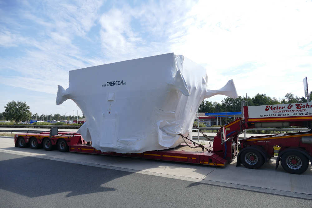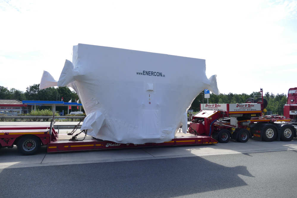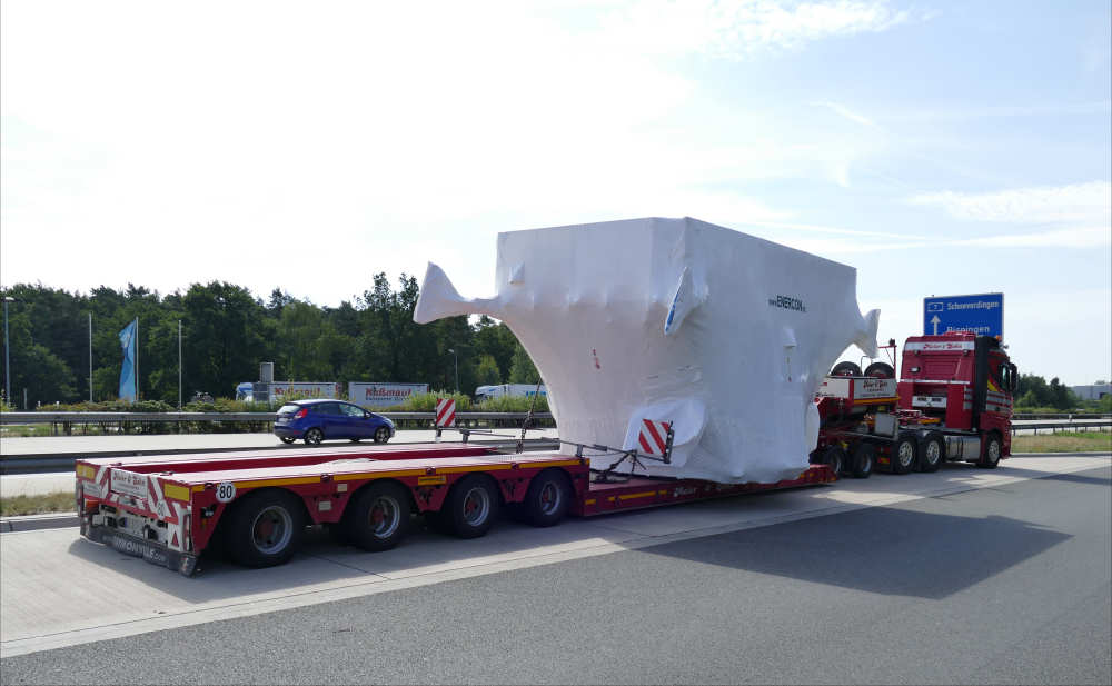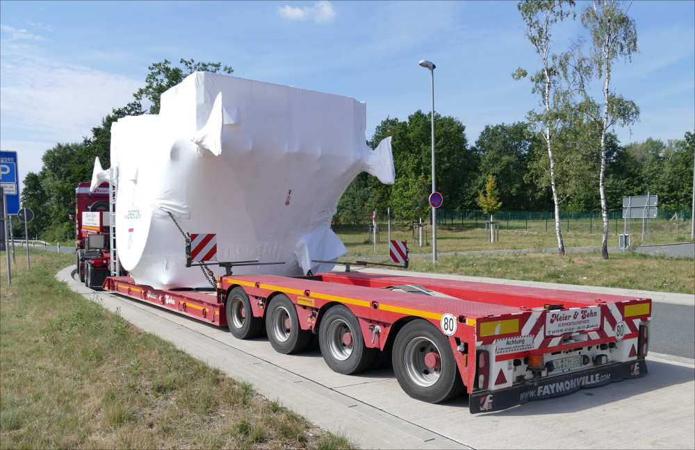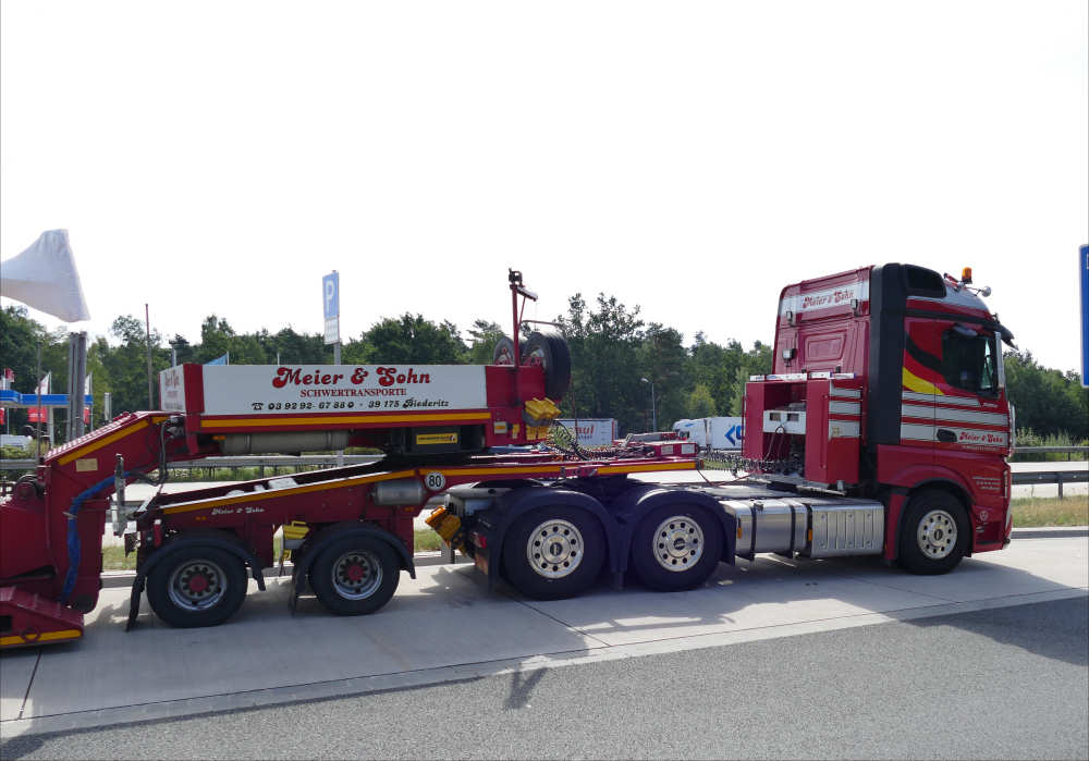 MB 2858 Actros MP 4 mit Faymonville 2-4 Jeepdollytieflader und WEA Maschinenteil