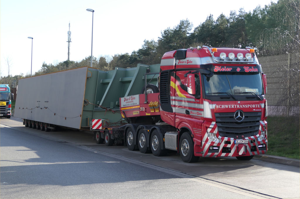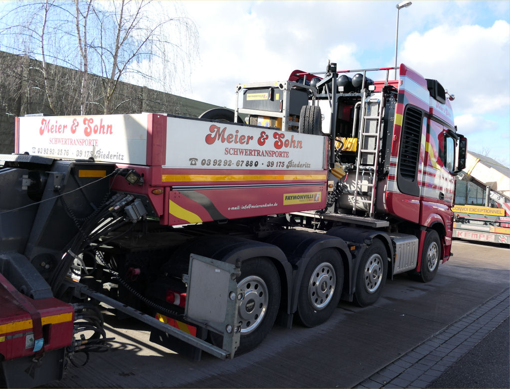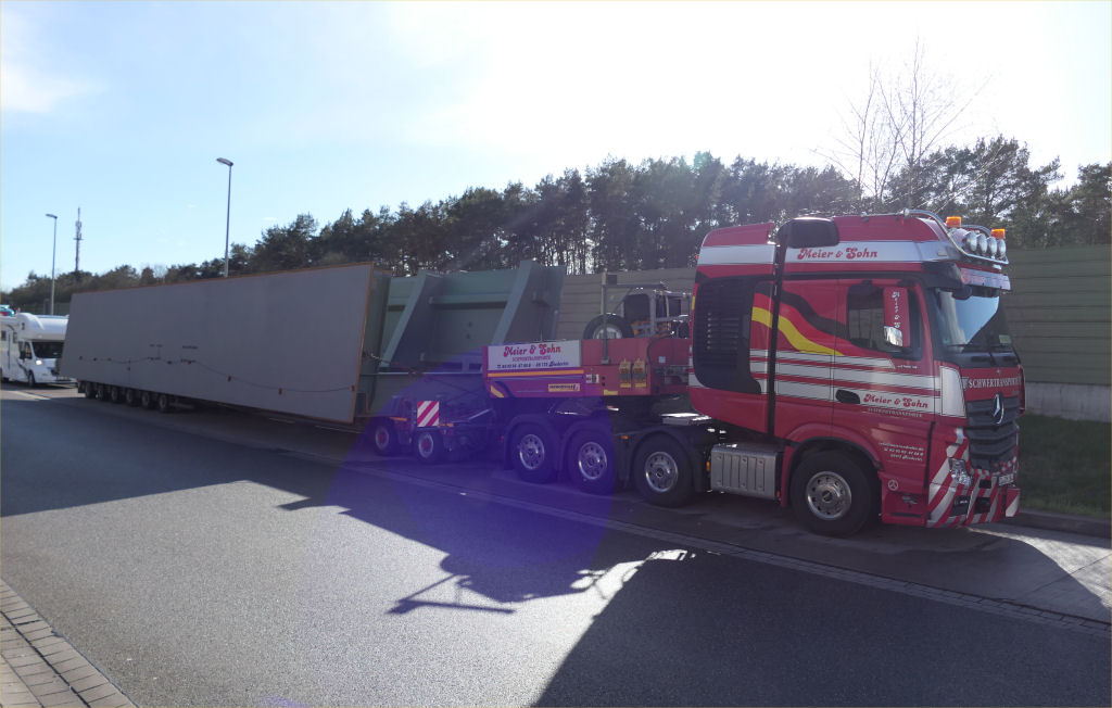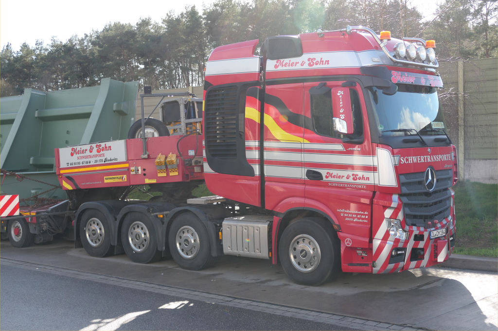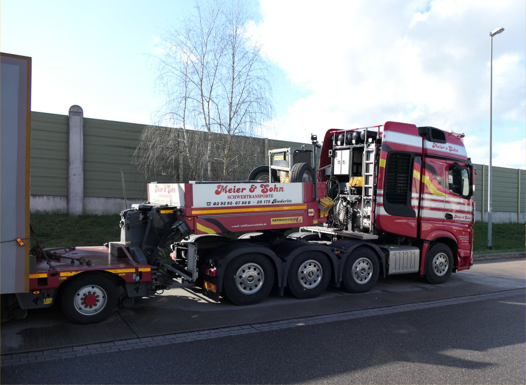 MB 4163 Actros SLT mit Faymonville 2-6 Semitieflader und Brückenteil für die Rader Hochbrücke