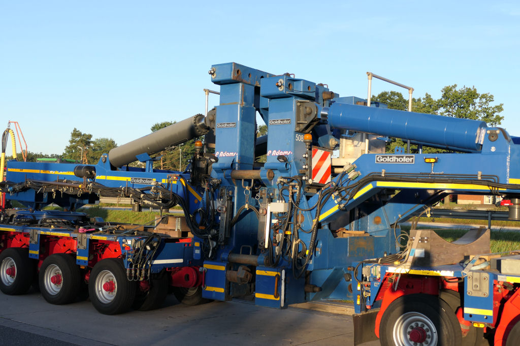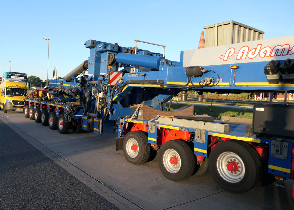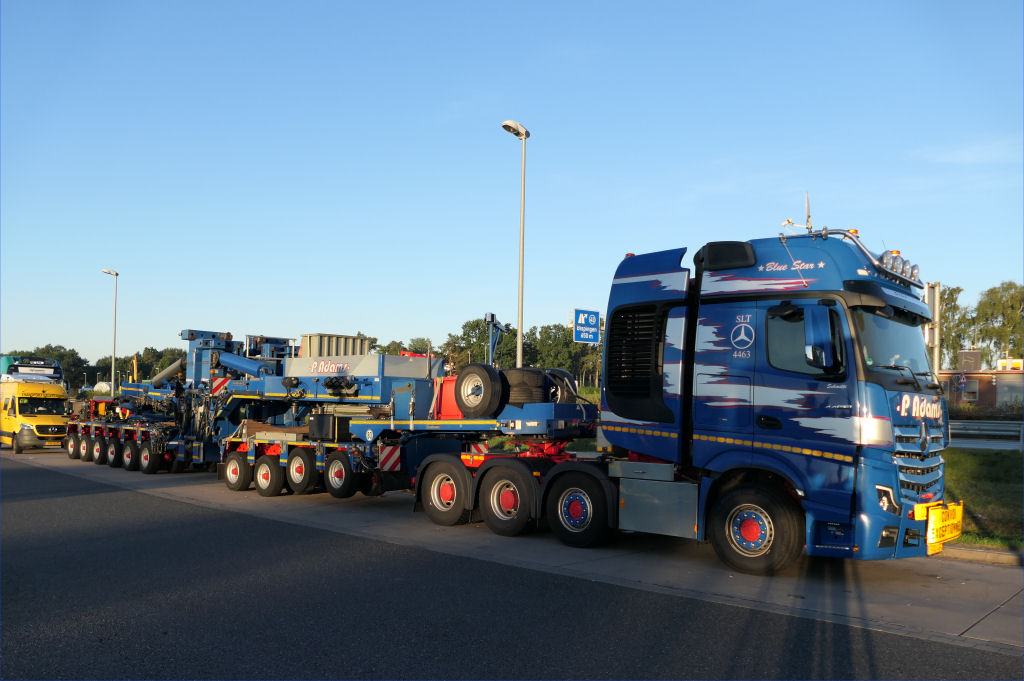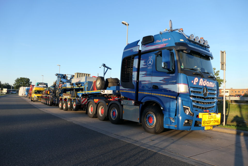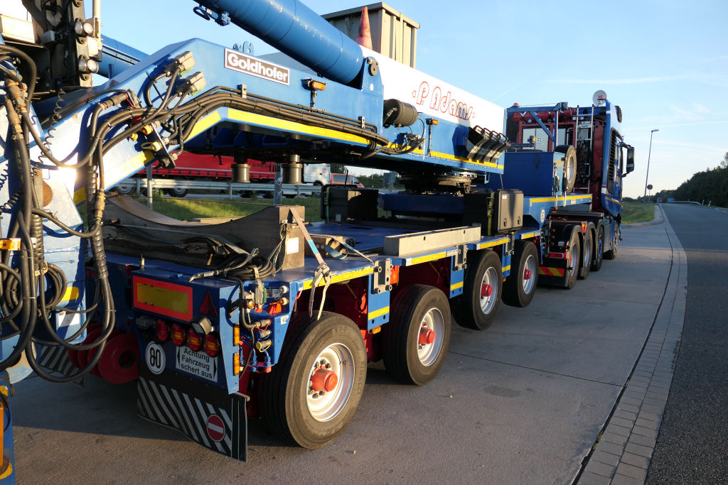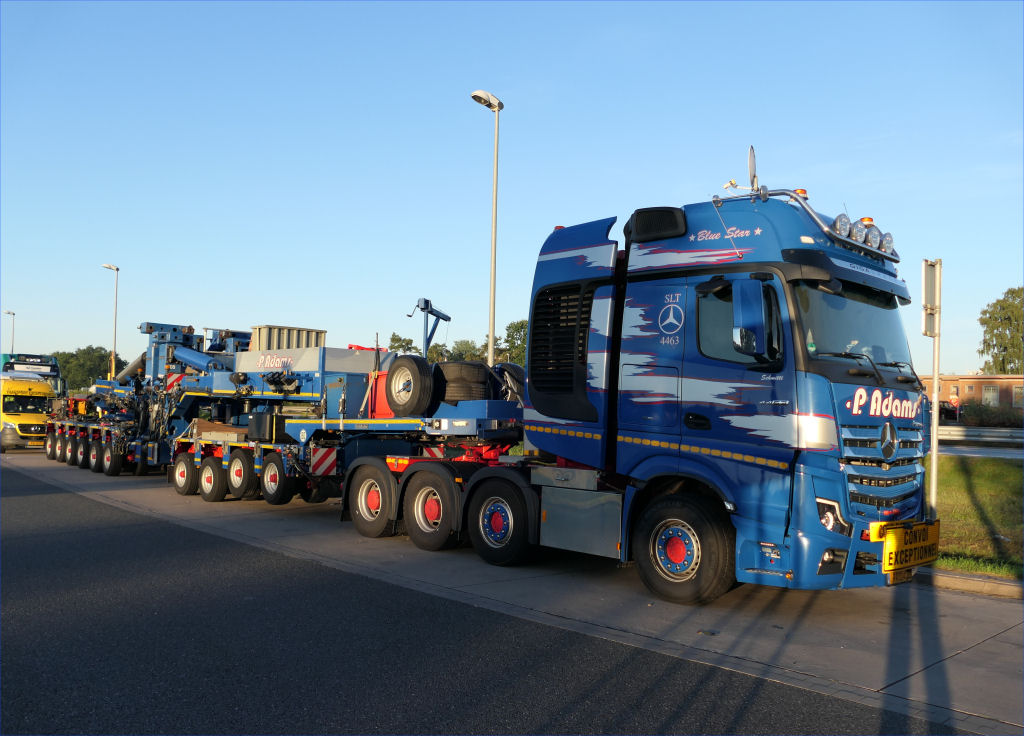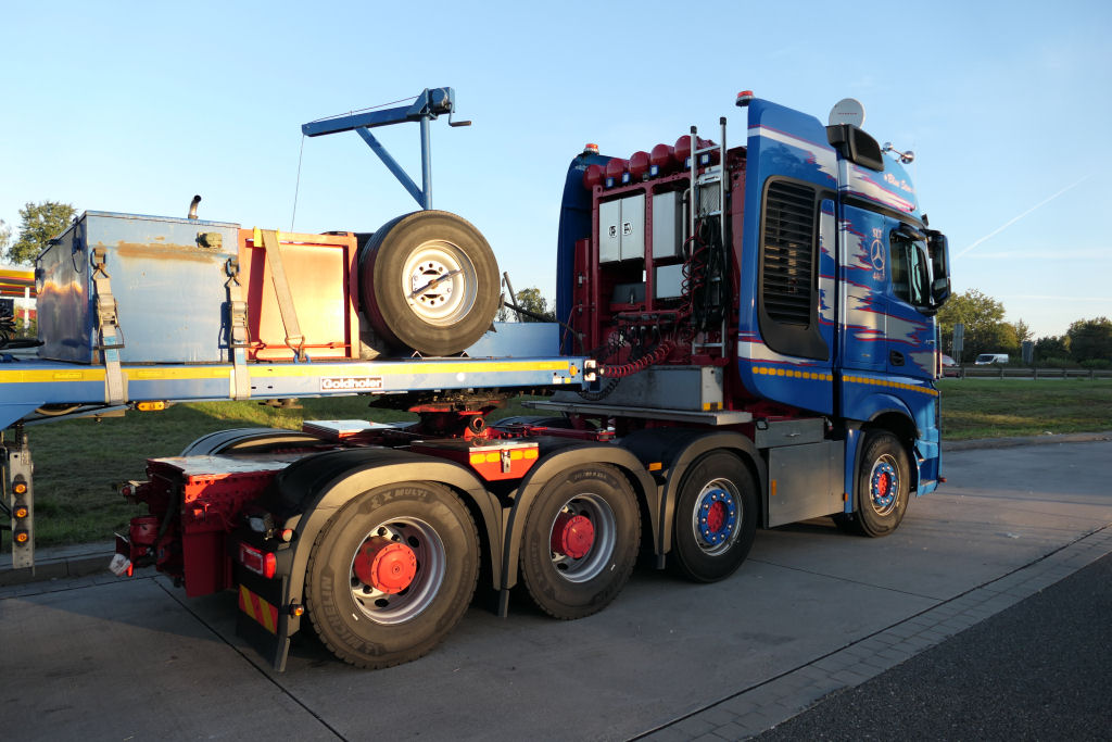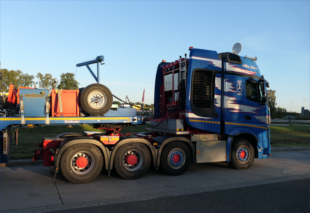 MB 4163 Actros SLT "Blue Star" mit Goldhofer 4/6 Rohradapterkombination auf Leerfahrt