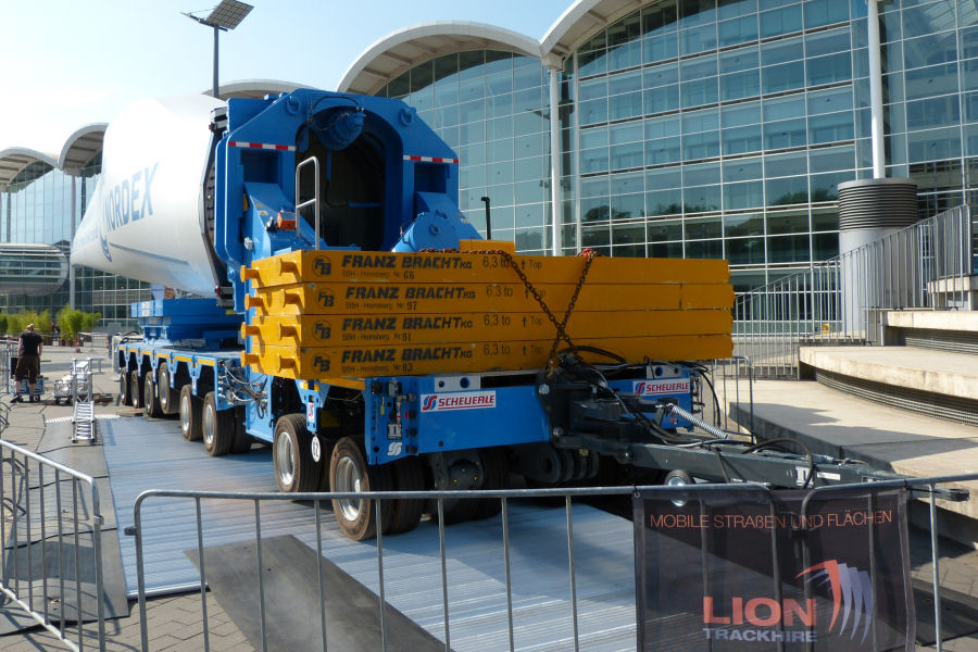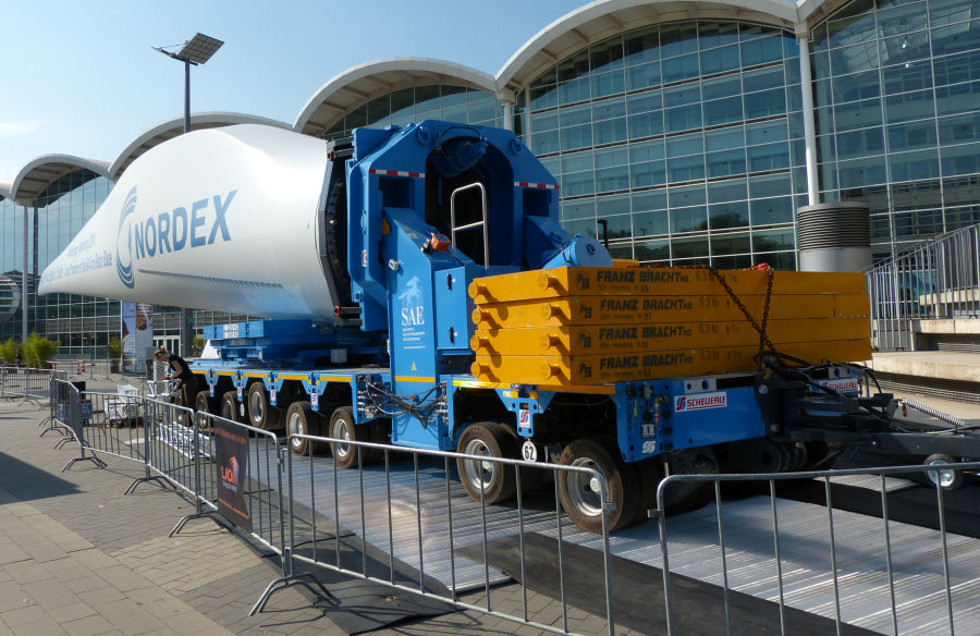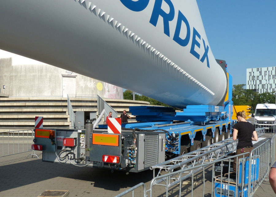 Ausgestellt wurde der Transporter mit einem18 t schweren und 64, 4 m langen Rotorblatt von Nordex.