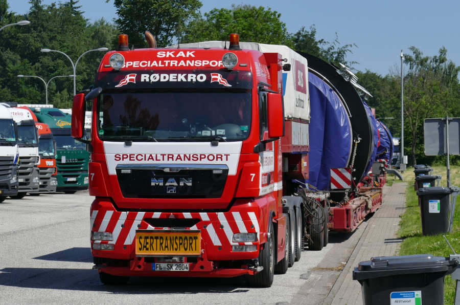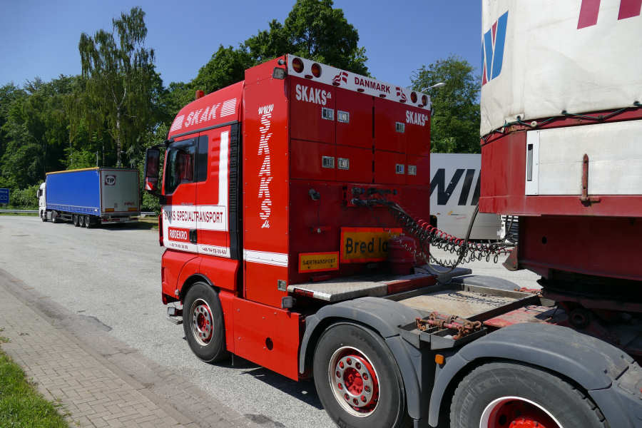 Anfang Juni 2016 stand Skak Specialtransport mit zwei Kaminteiltransporten auf dem Rasthof Buddikate West.